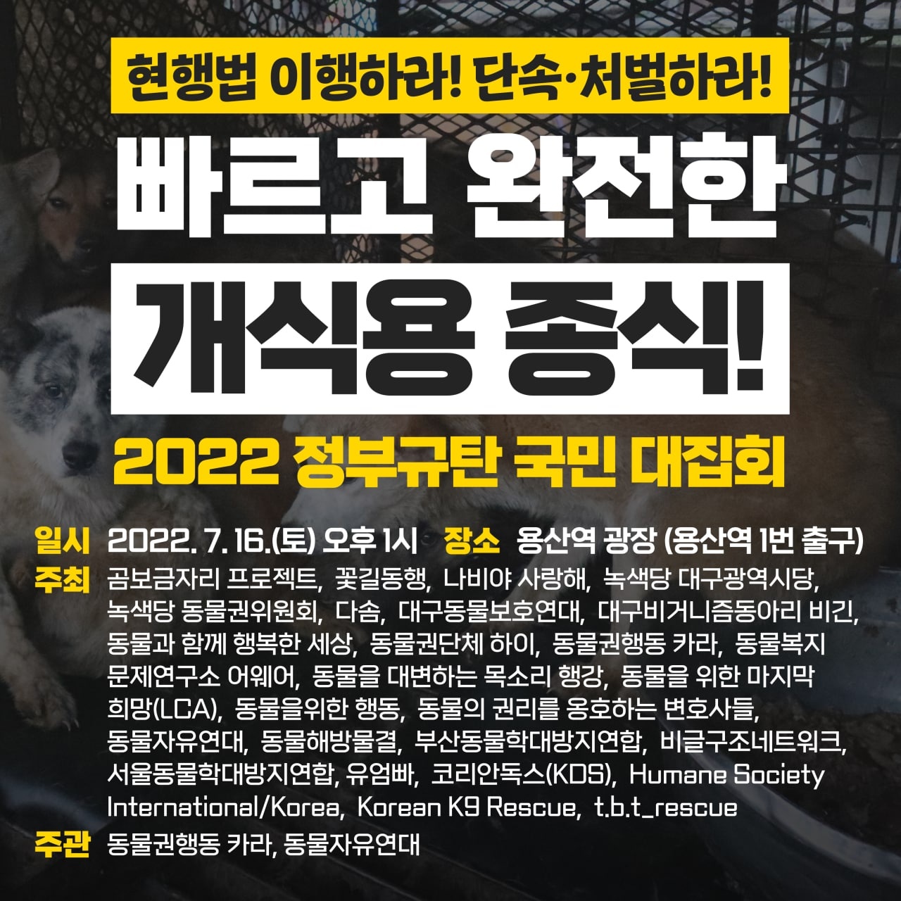 개식용 종식을 촉구하는 국민행동은 7월 16일(토) 오후 1시부터 용산역 광장에서 정부 규탄 국민 대집회를 개최합니다. 이번 집회에는 뜻을 함께 하는 시민 단체와 국민들이 한 자리에 모여 정부에 조속한 개식용 종식을 촉구할 예정입니다.