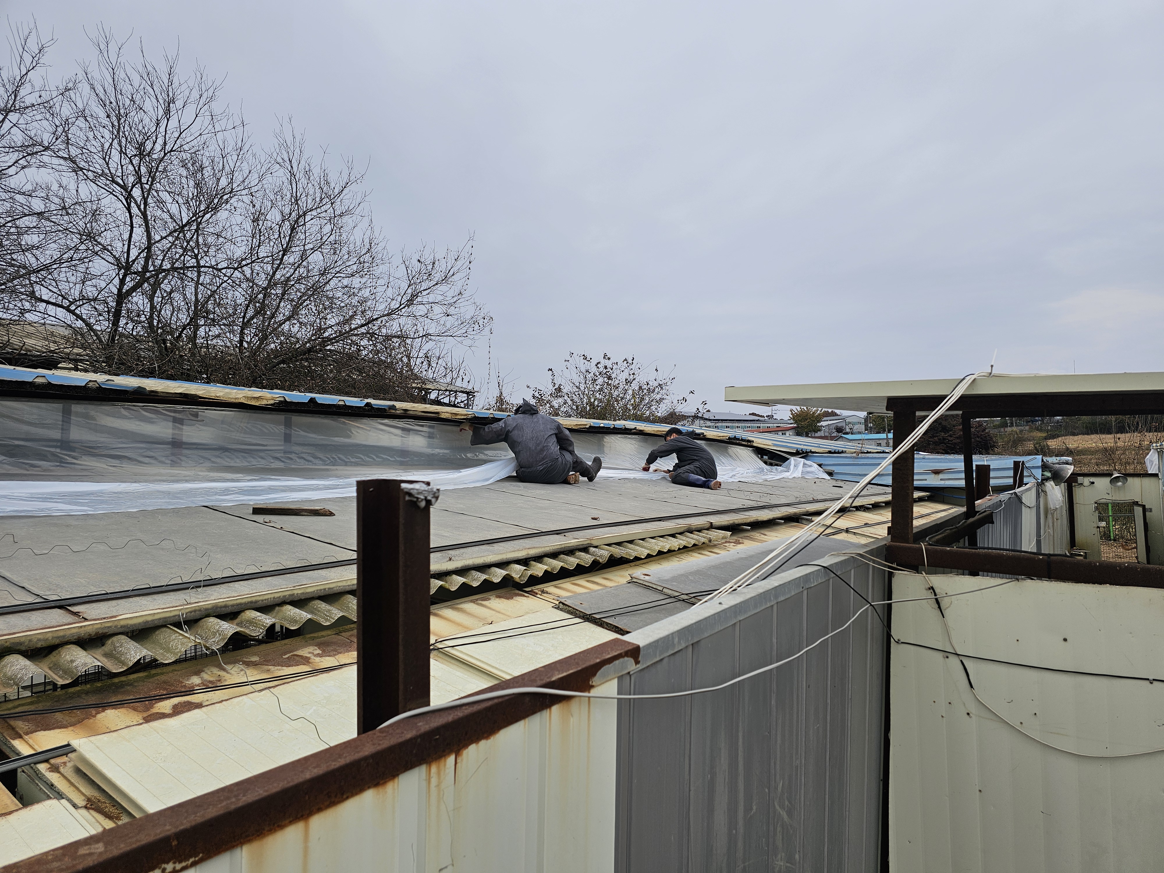 겨울 찬바람이 아이들 견사에 들이닥치지 못하게 견사 지붕과 벽면 사이의 틈을 꼼꼼하게 비닐 작업해주셨어요🥹