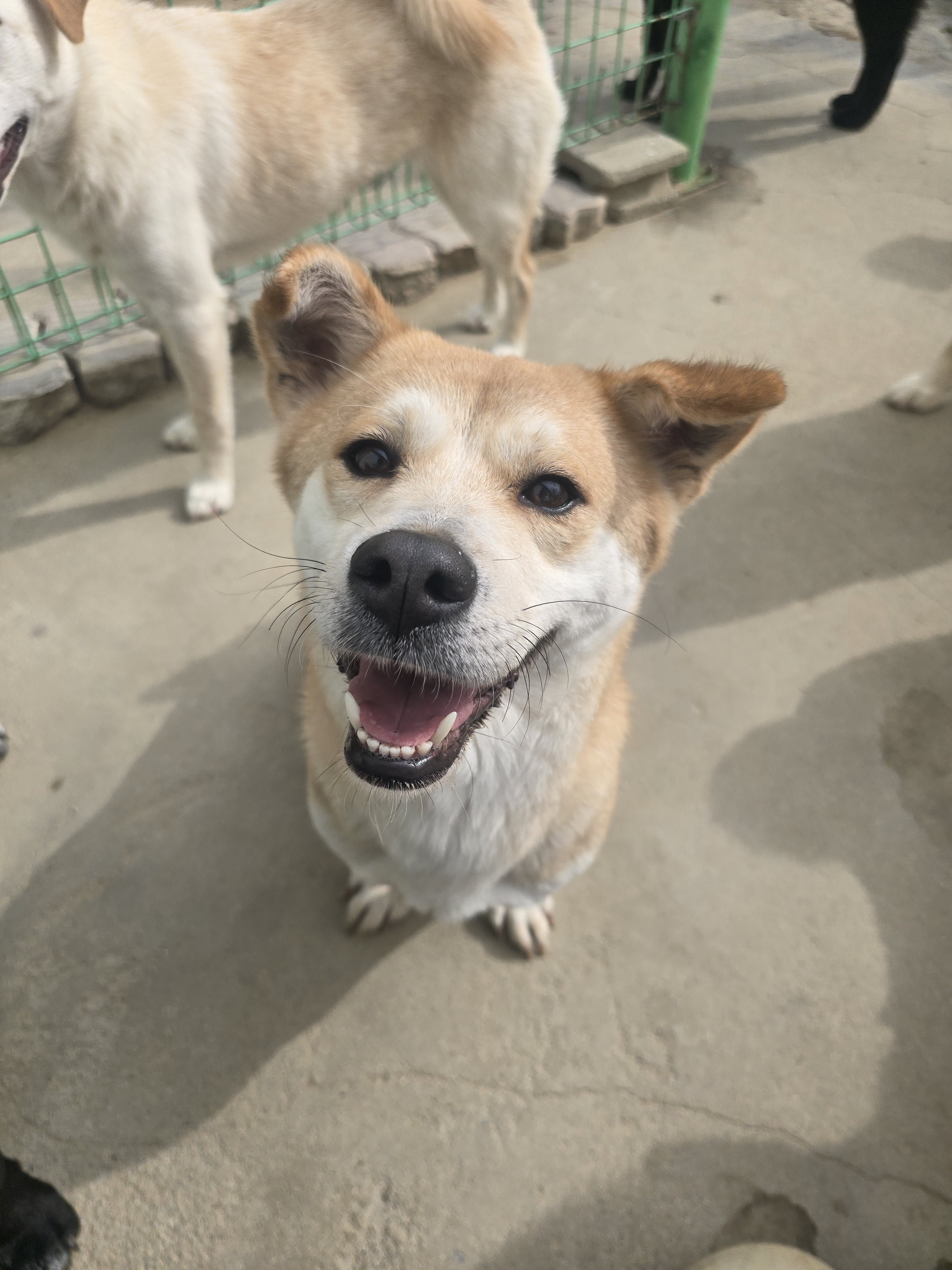 처음에는 바짝 긴장한 모습이었지만 2분도 되지 않아 꼬리를 올리고 쉼터 친구들을 탐색하기 시작했어요.