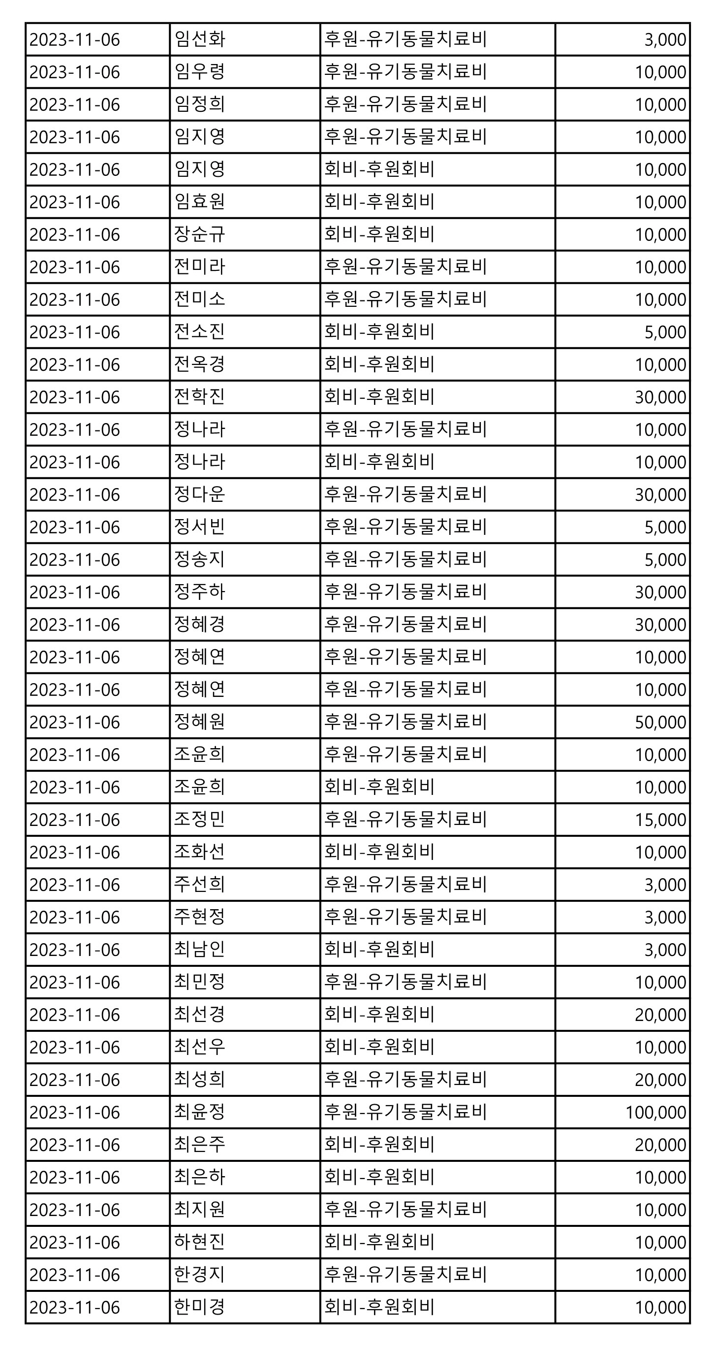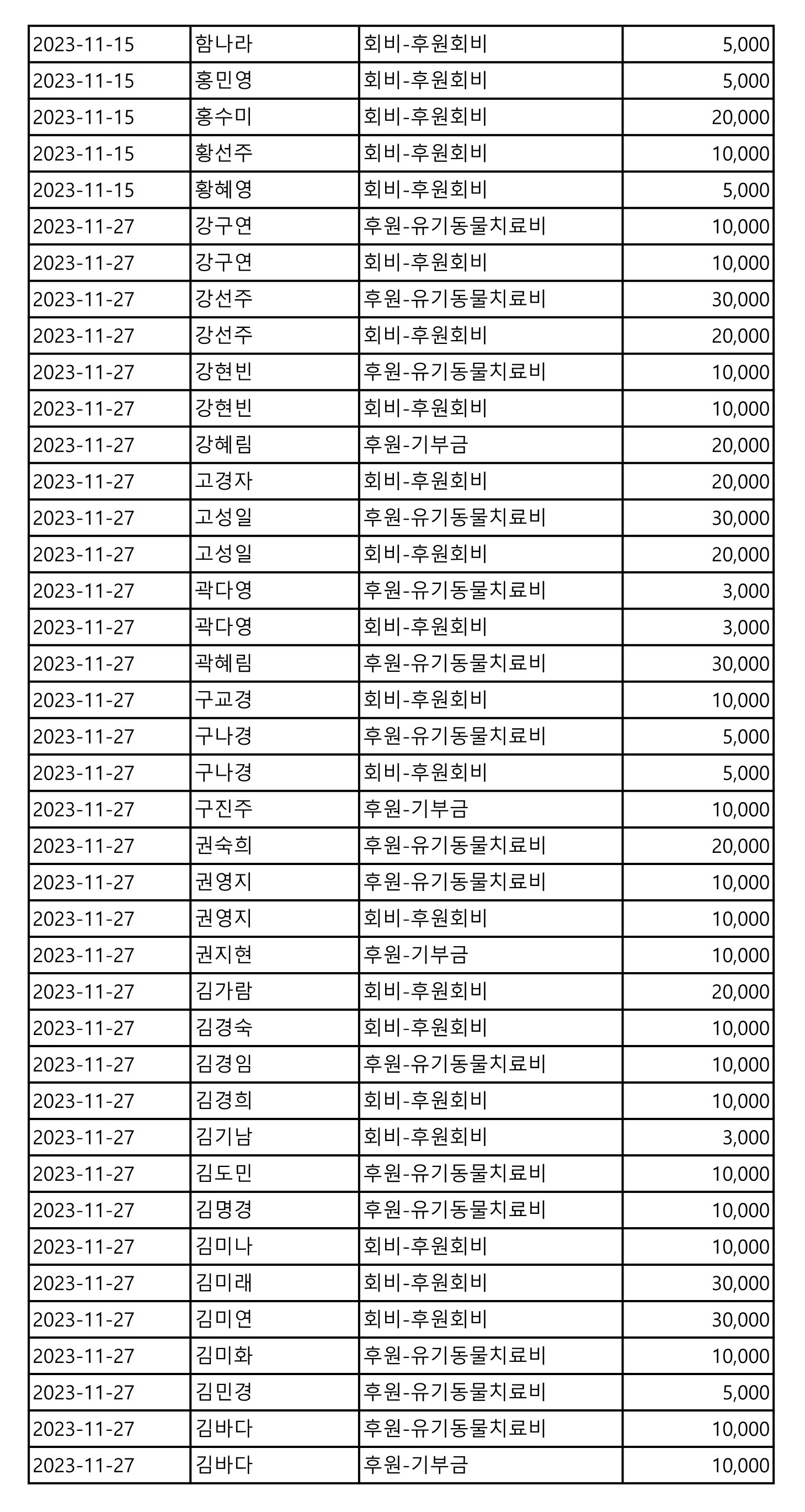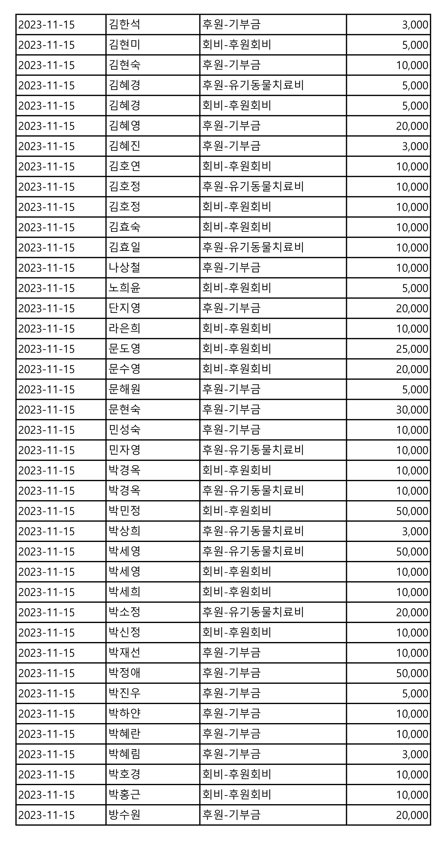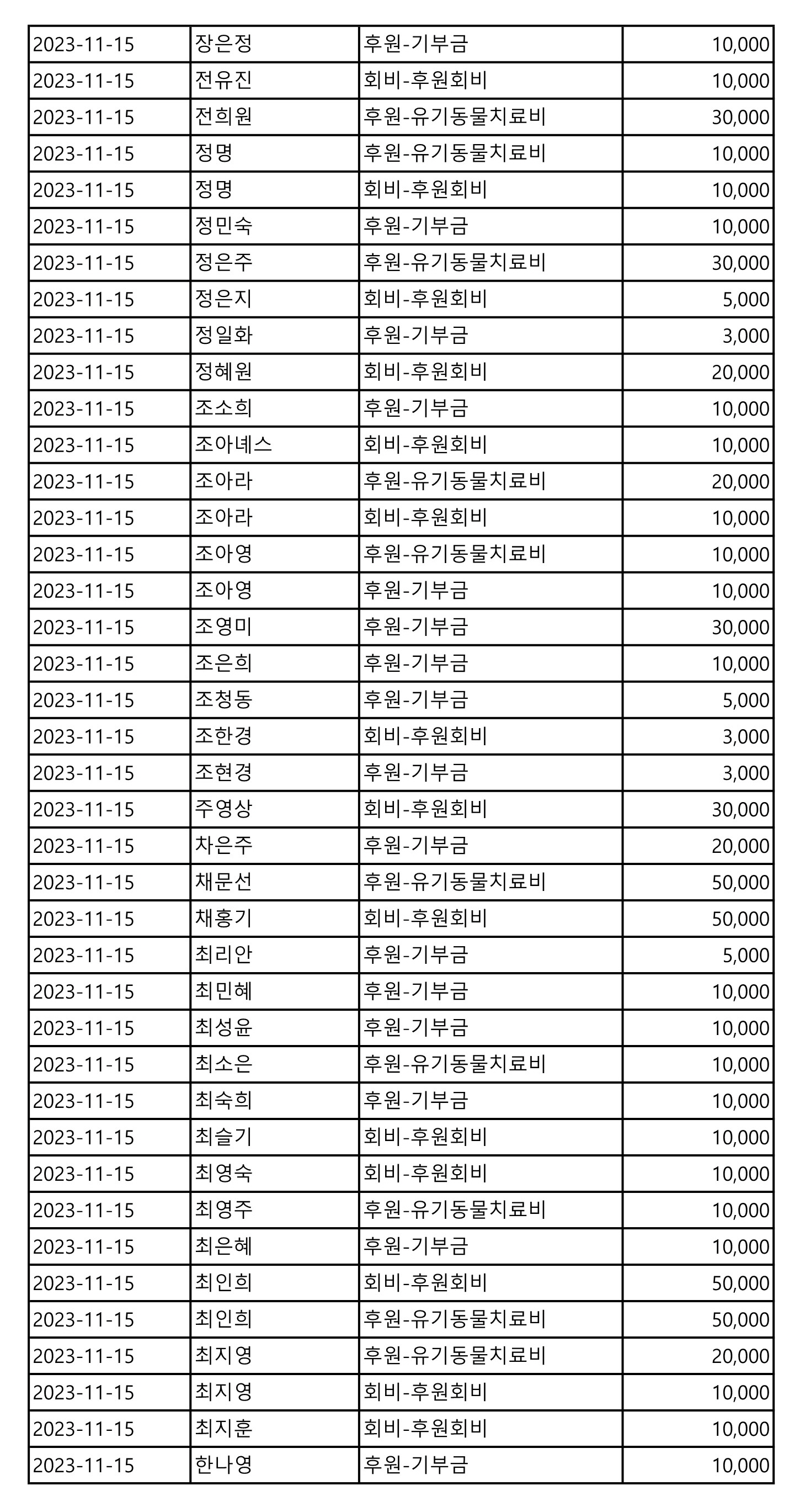 2023년 11월 CMS, 신용카드, 계좌입금을 이용한 정기, 일시후원 리스트