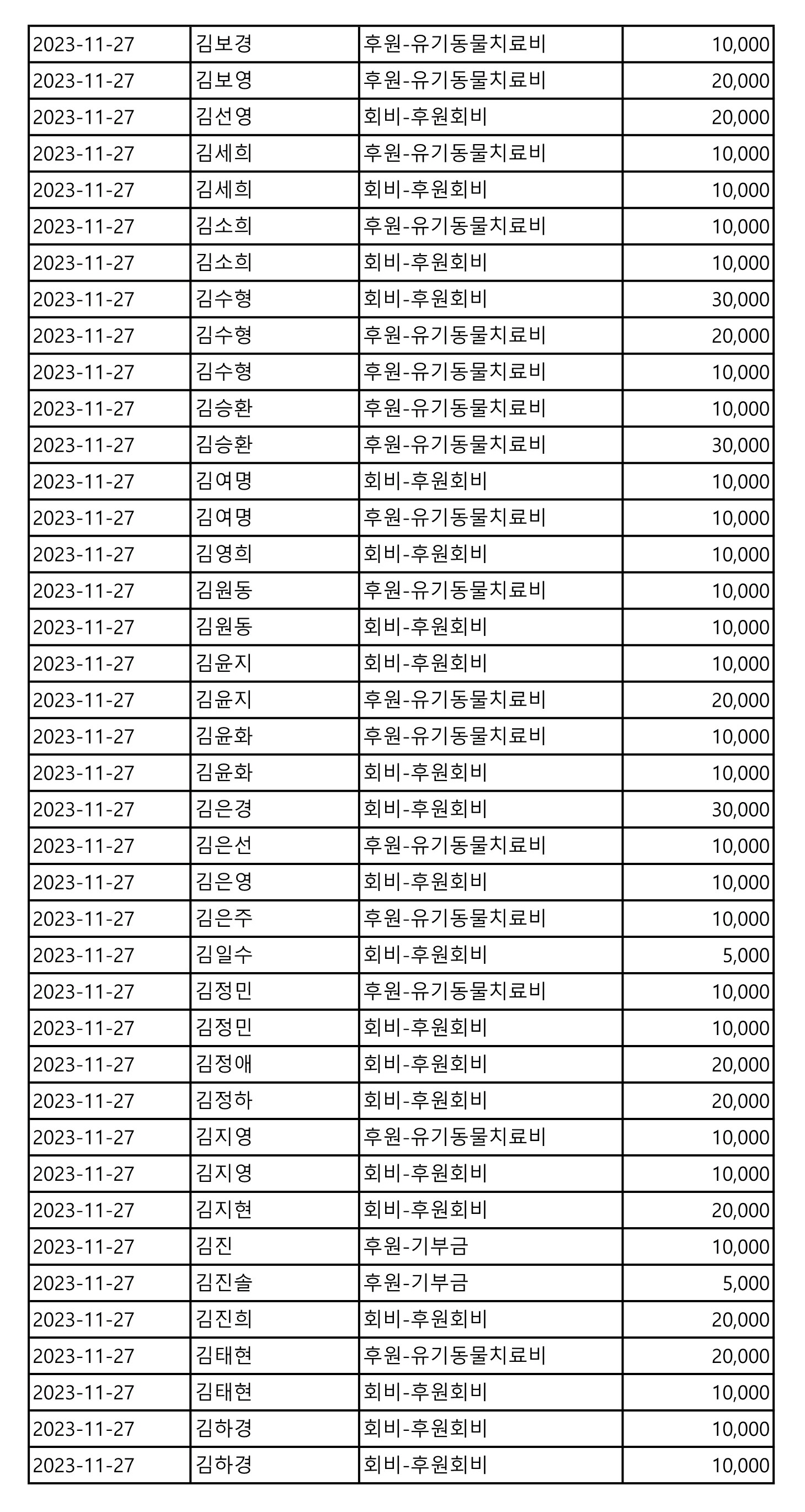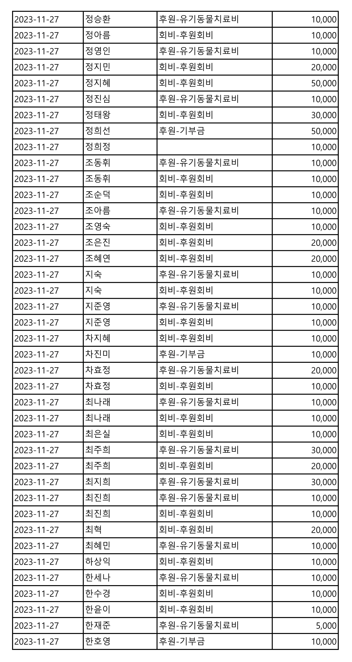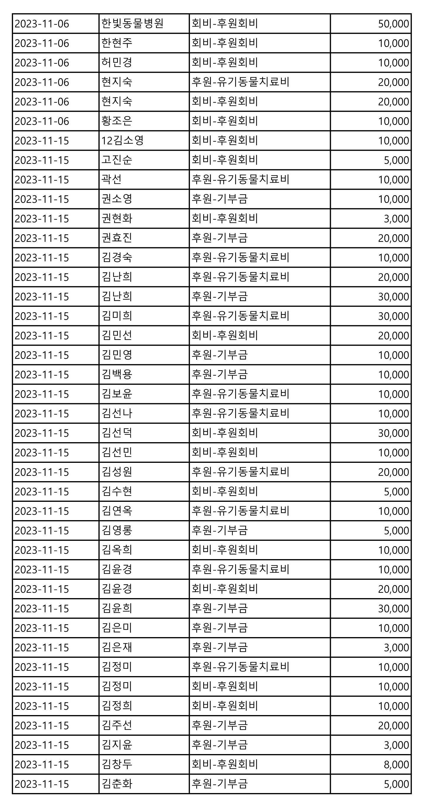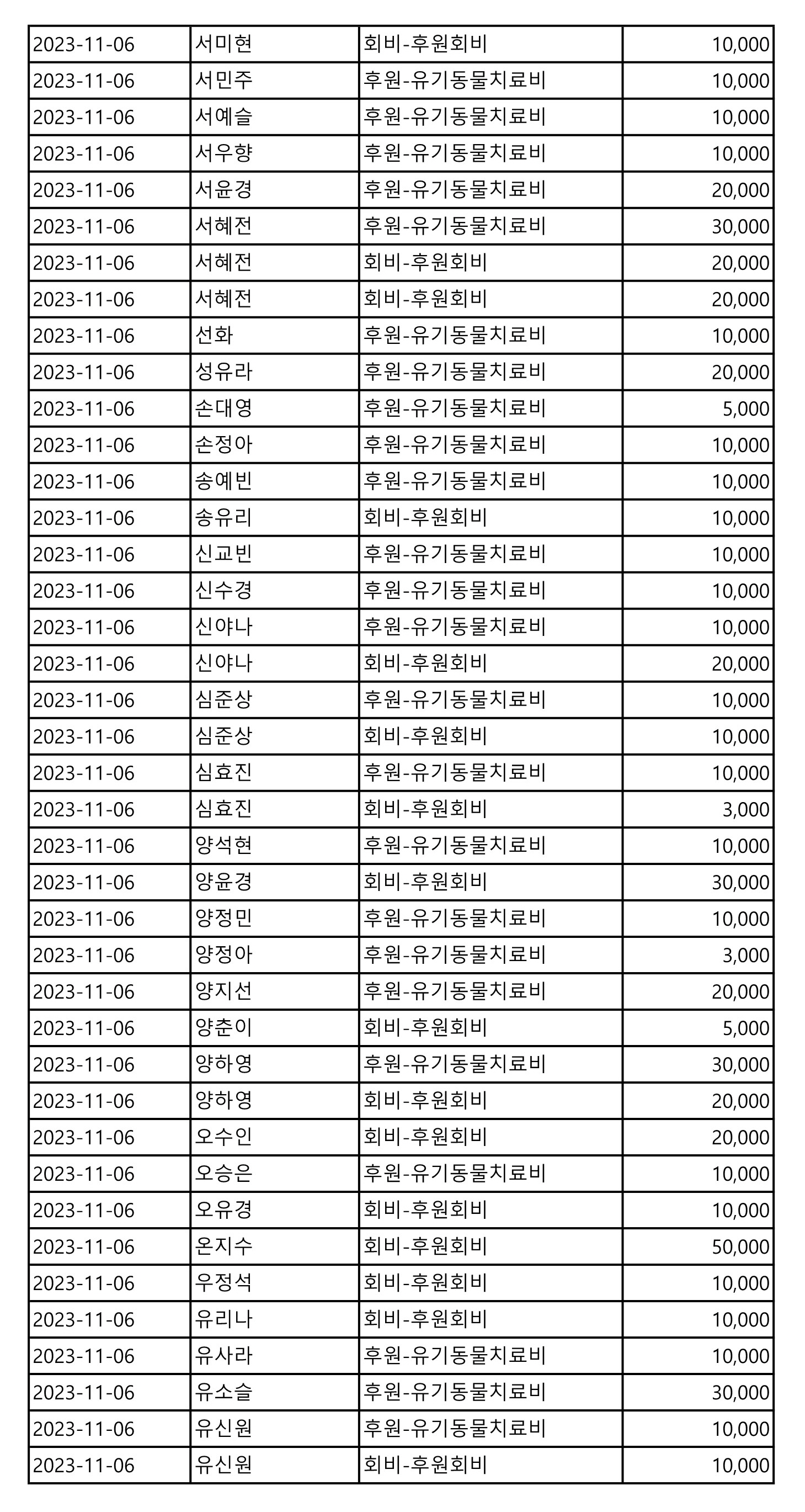 2023년 11월 CMS, 신용카드, 계좌입금을 이용한 정기, 일시후원 리스트