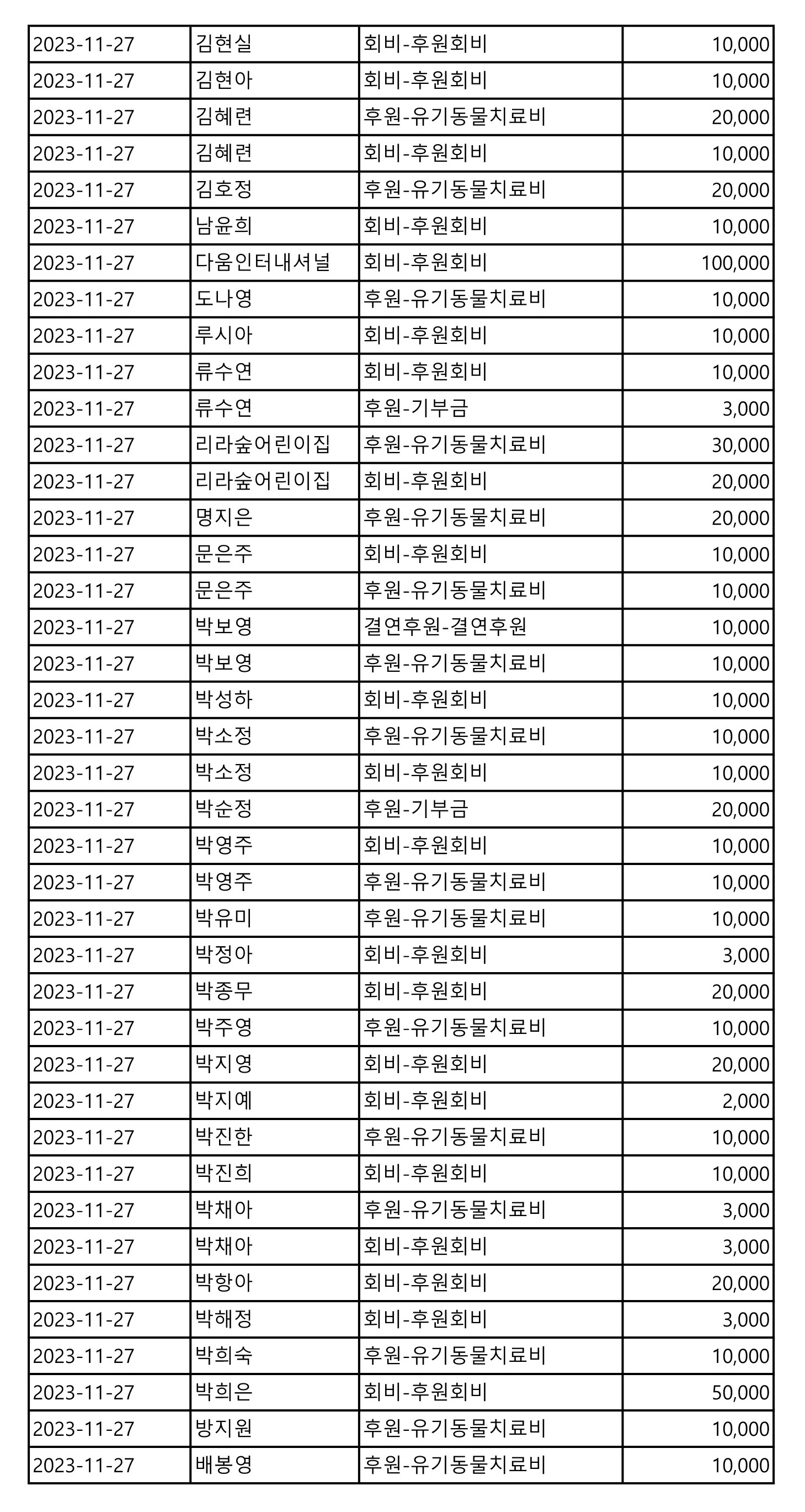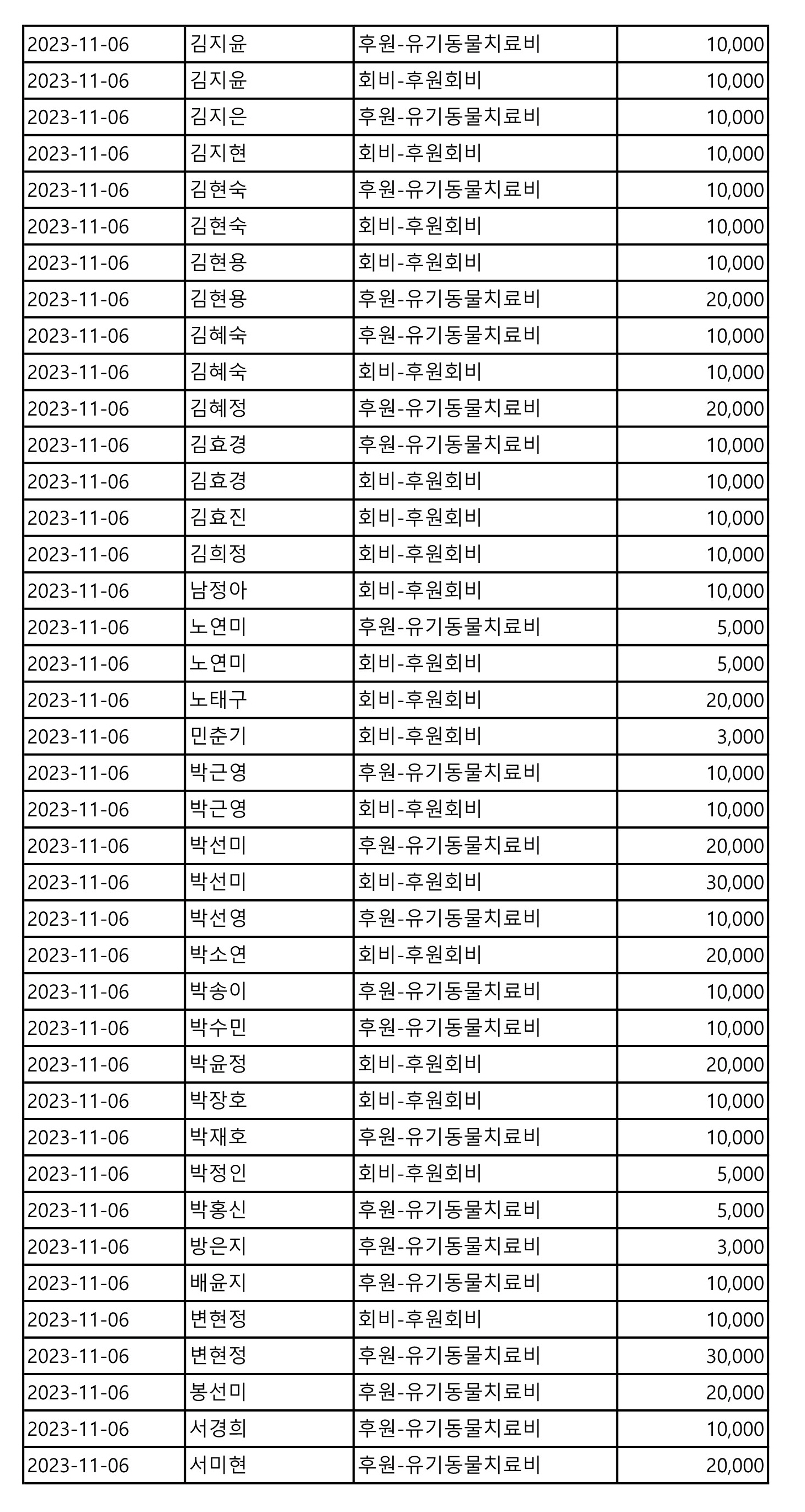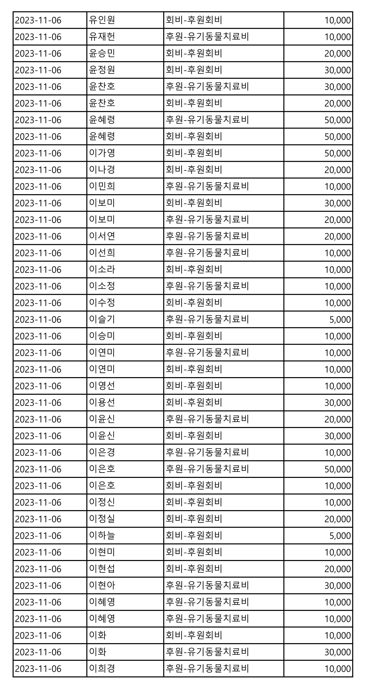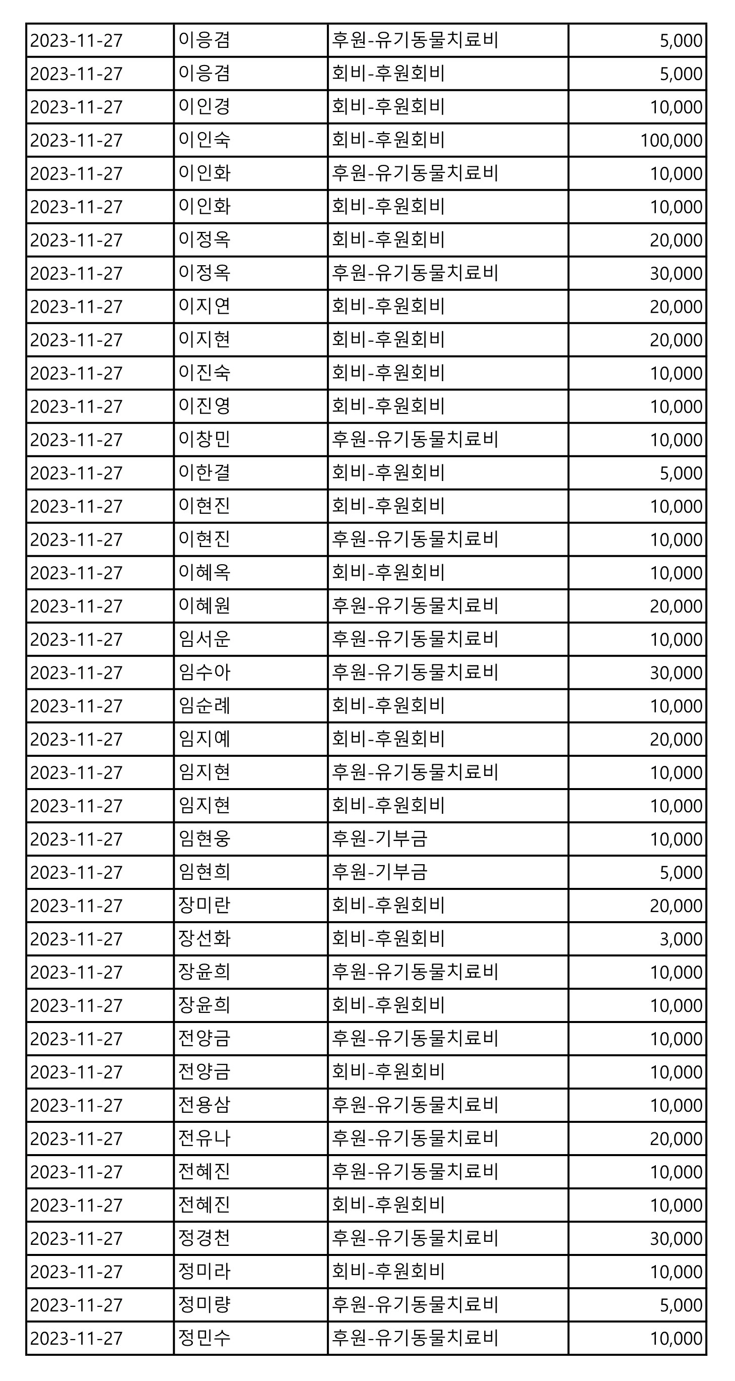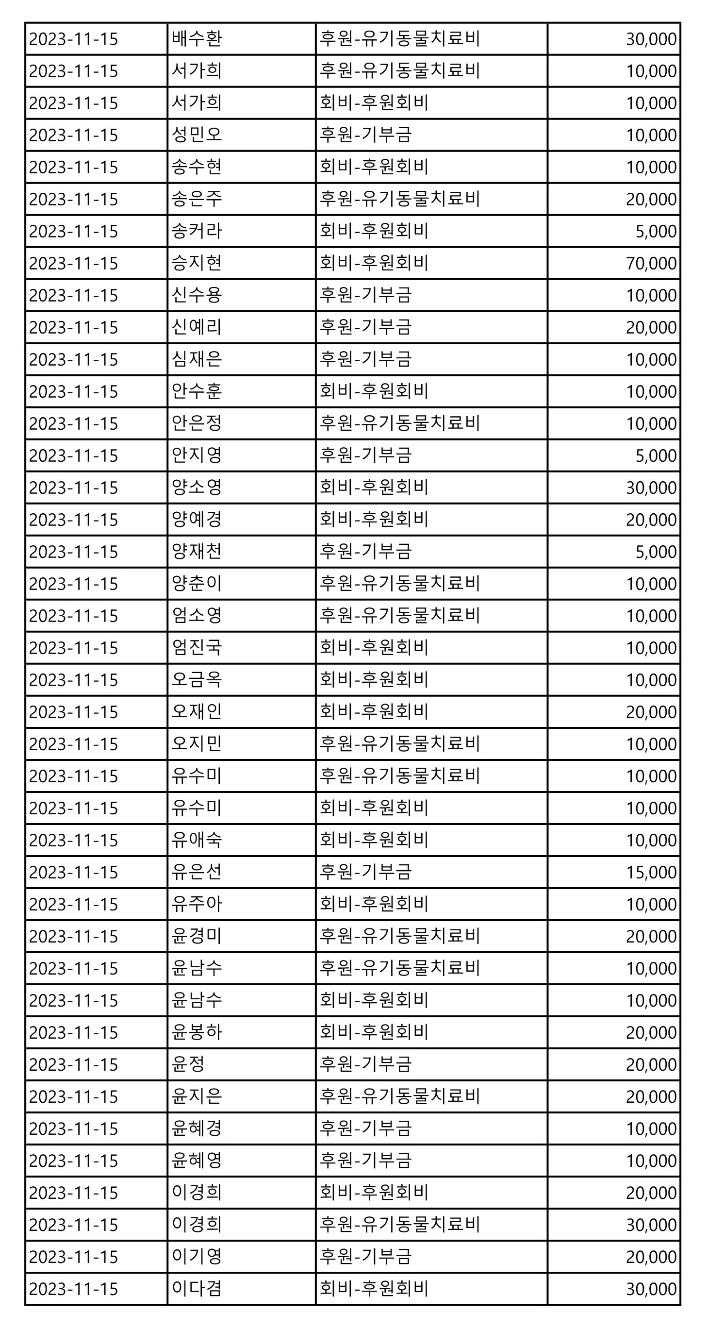 2023년 11월 CMS, 신용카드, 계좌입금을 이용한 정기, 일시후원 리스트