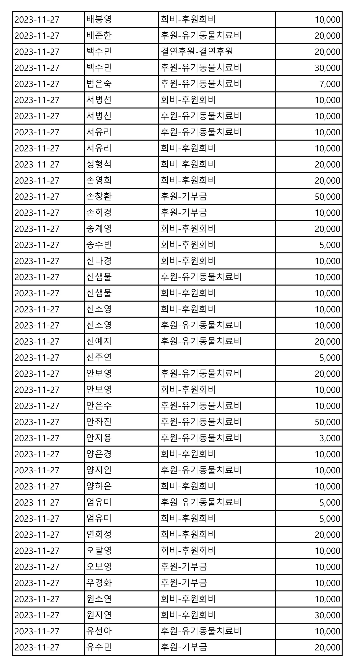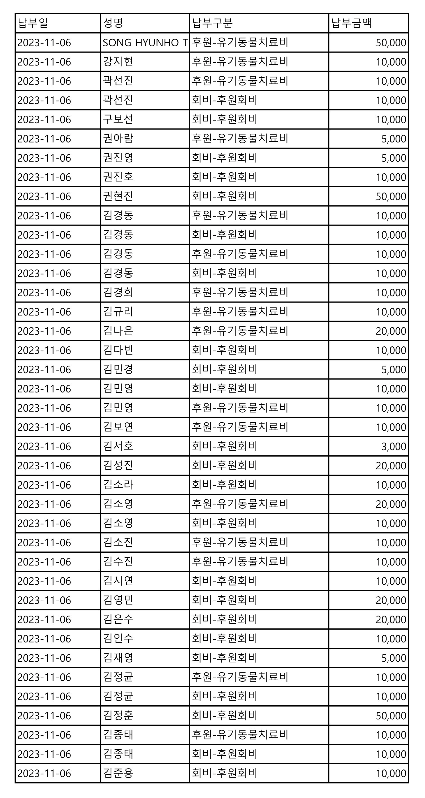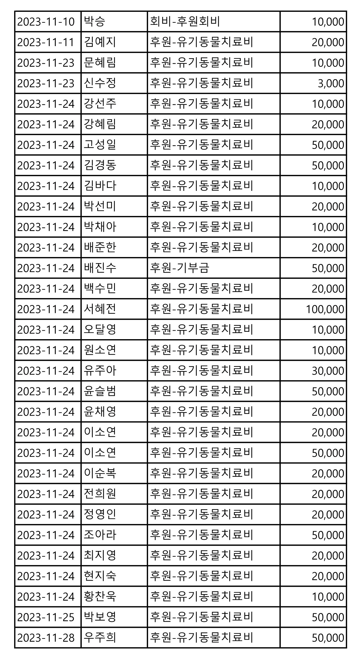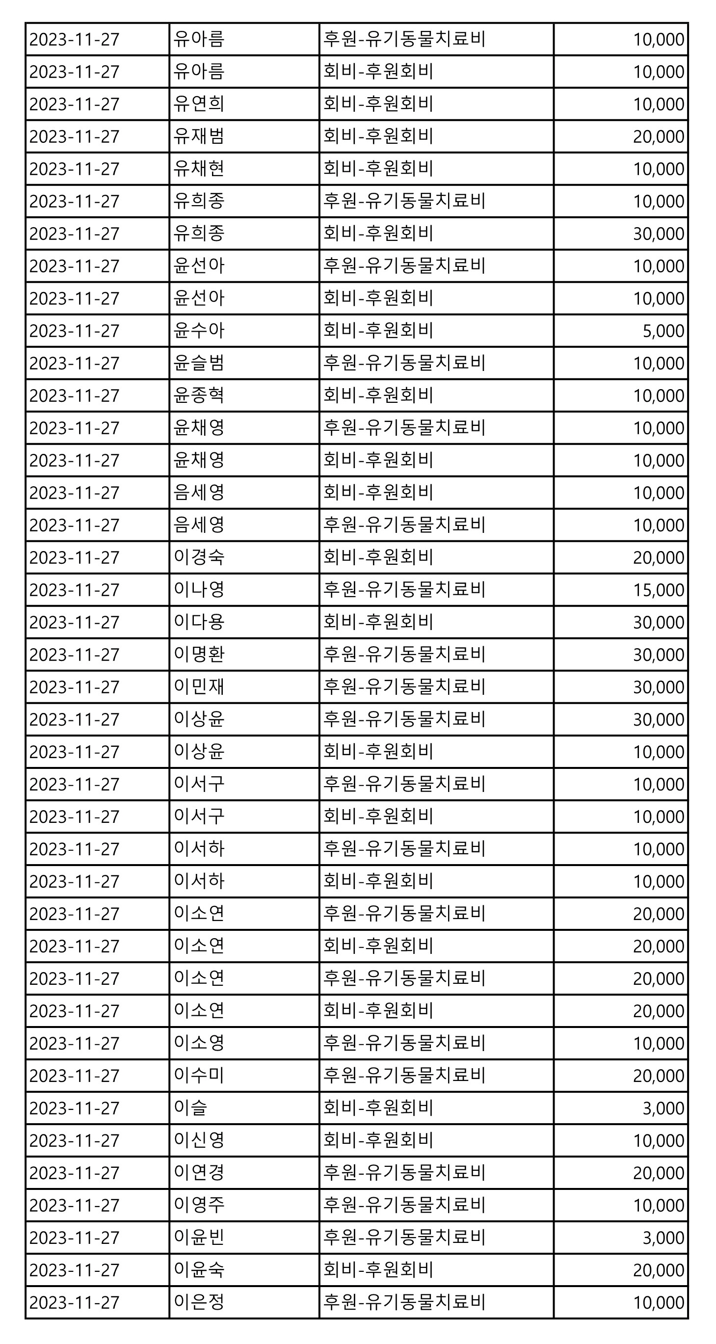 2023년 11월 CMS, 신용카드, 계좌입금을 이용한 정기, 일시후원 리스트