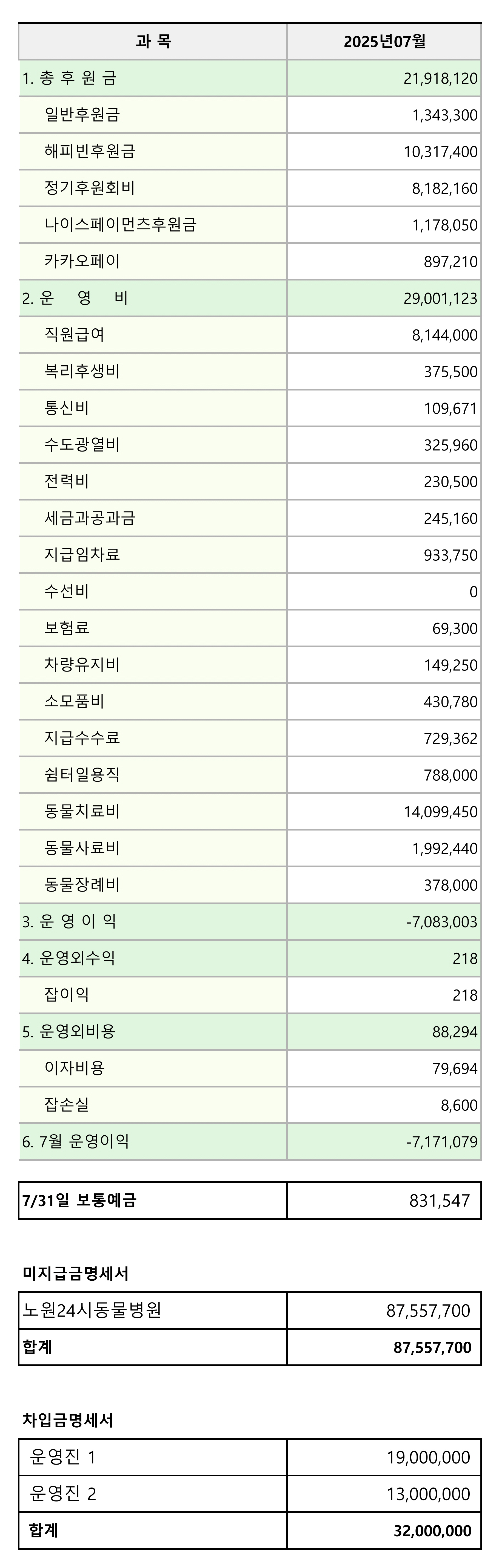 2025년 07월 후원 및 지출 내역