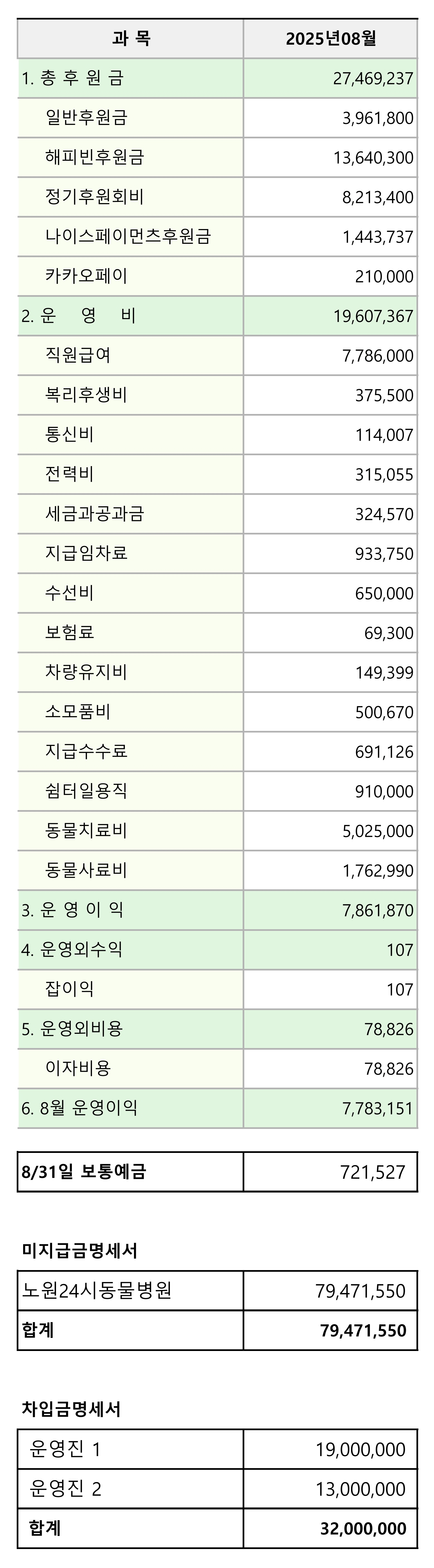 2025년 08월 후원 및 지출 내역