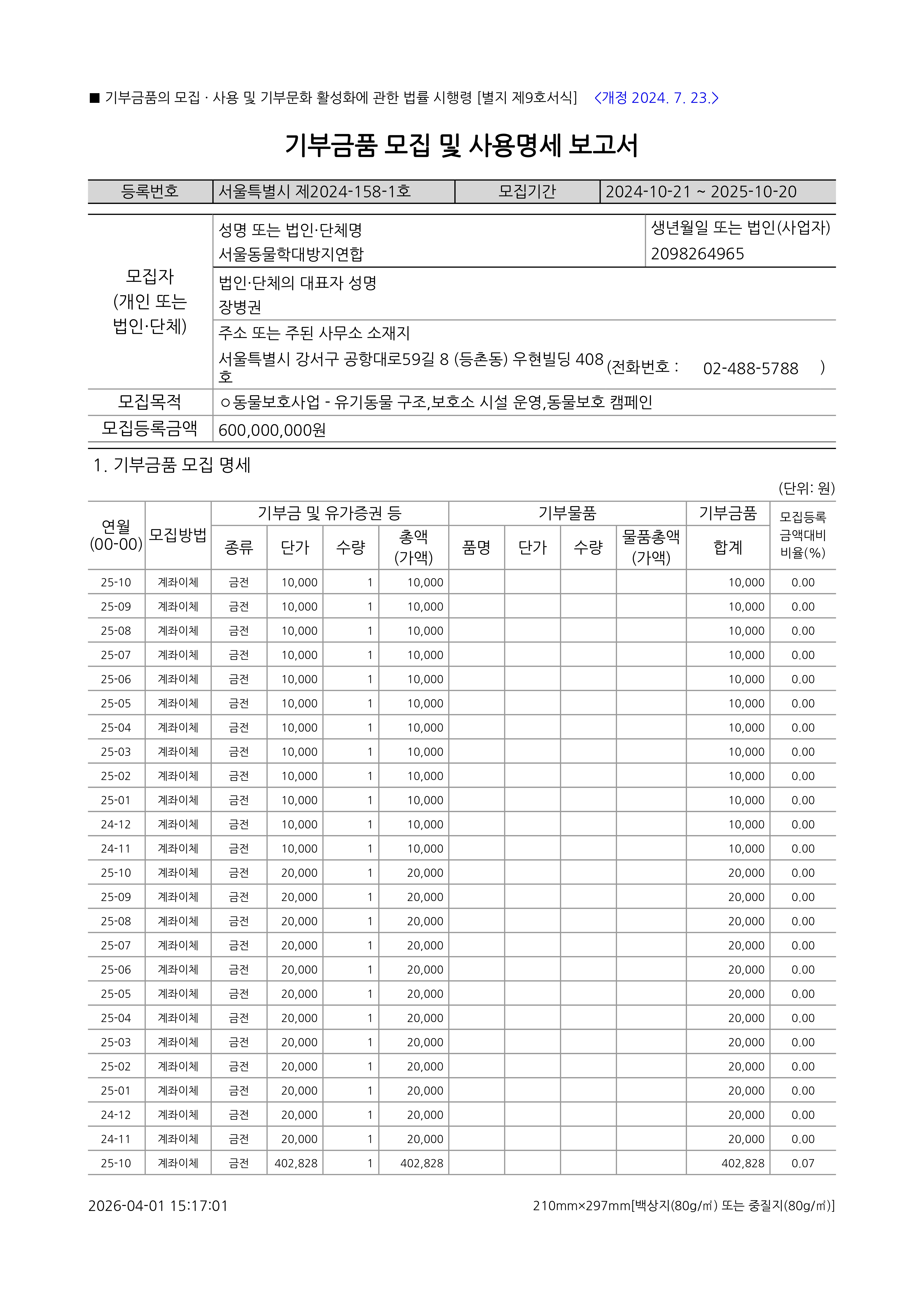기부금품 모집 및 사용명세 보고서 (서울특별시 제2024-158-1호, 모집기간 2024-10-21 ~ 2025-10-20)