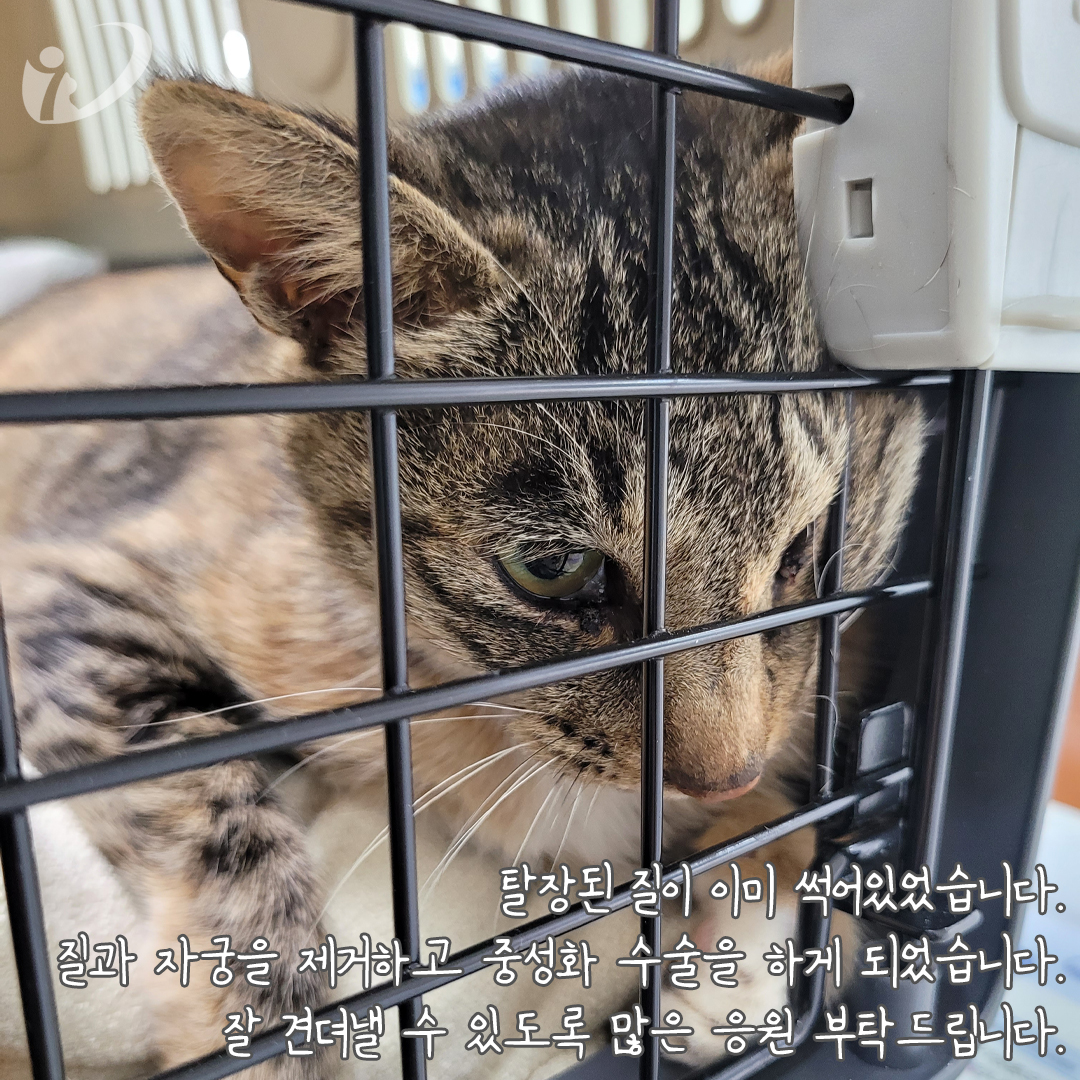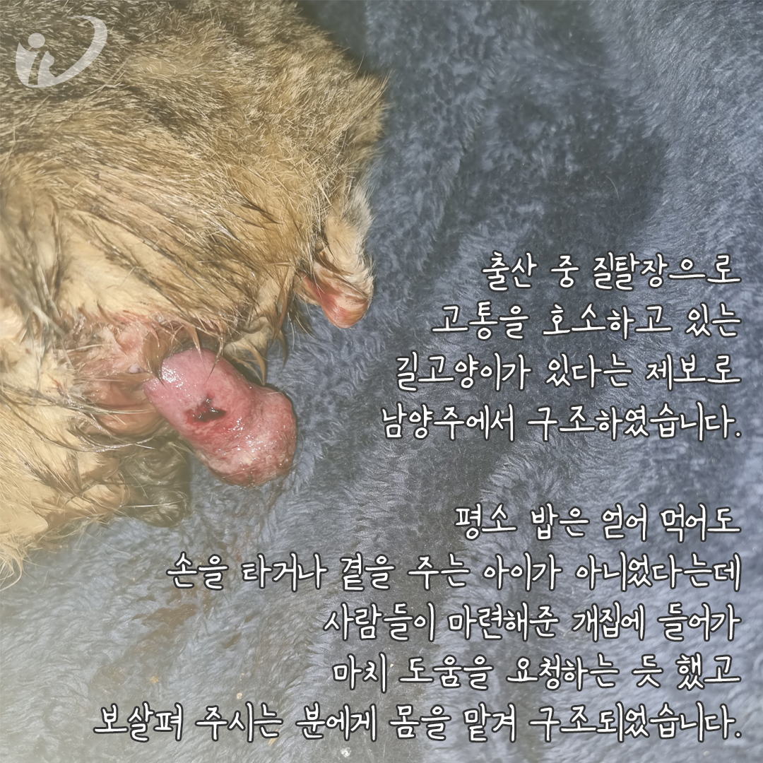 남양주에서 출산 중 질탈장으로 고통을 호소하는 고양이가 있다는 제보를 받고 구조하였습니다.