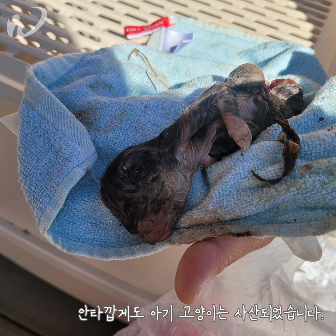 출산을 하기 위해서였는지 사람들이 마련해준 개집에 들어가 산통을 견뎠지만 그 과정에서 질탈장이 되고 말았습니다. 어미인 나비는 탈진하고, 아기 고양이는 그대로 사산되고 말았습니다.