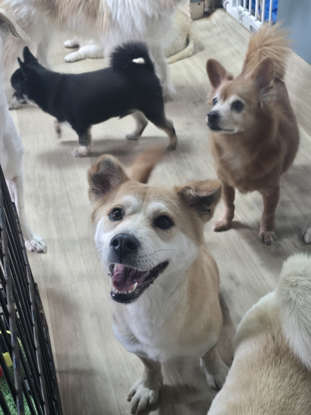 처음에는 바짝 긴장한 모습이었지만 2분도 되지 않아 꼬리를 올리고 쉼터 친구들을 탐색하기 시작했어요.