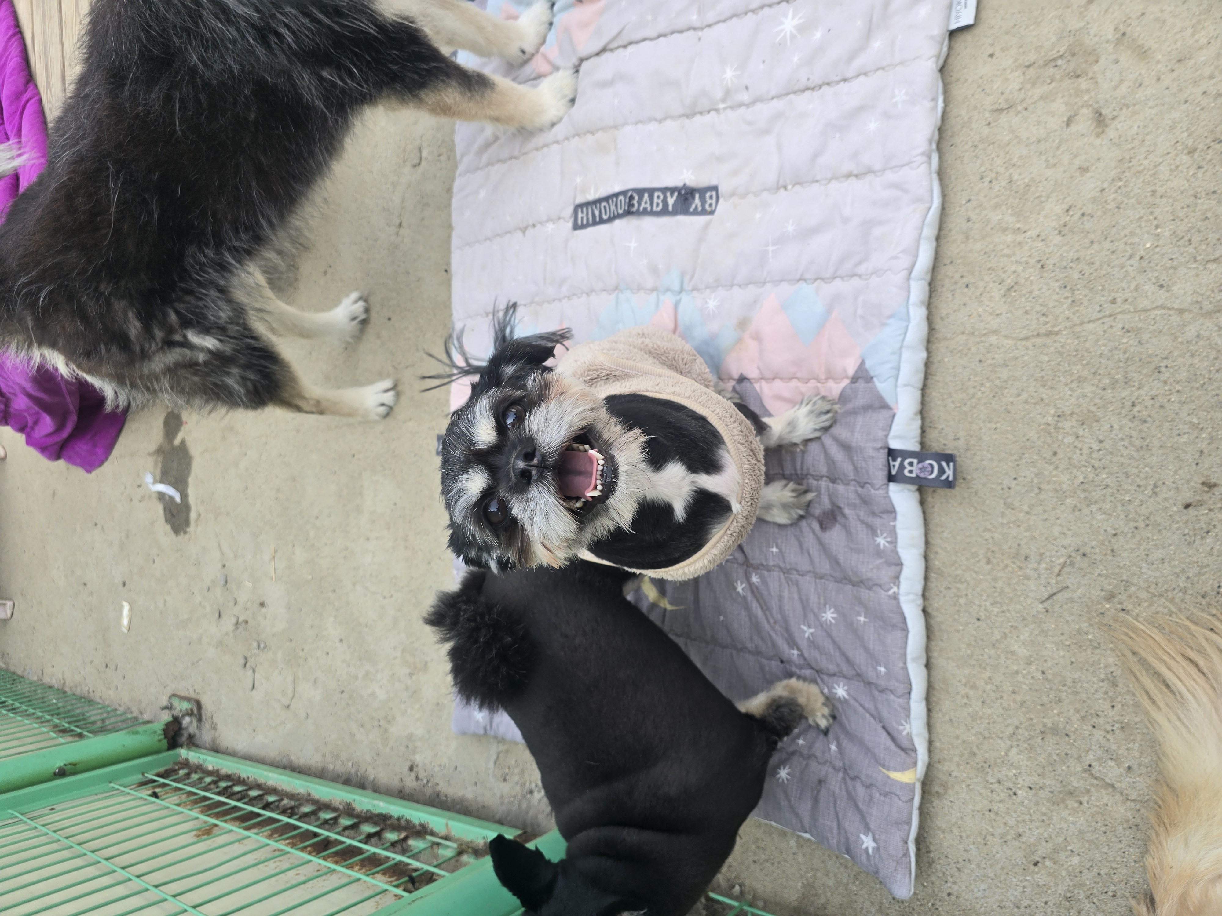 쉼터에 도착한 기부품 중에 봄빛이 물든 옷이 있어 시츄&치와와 가족에게 입혀보았어요.