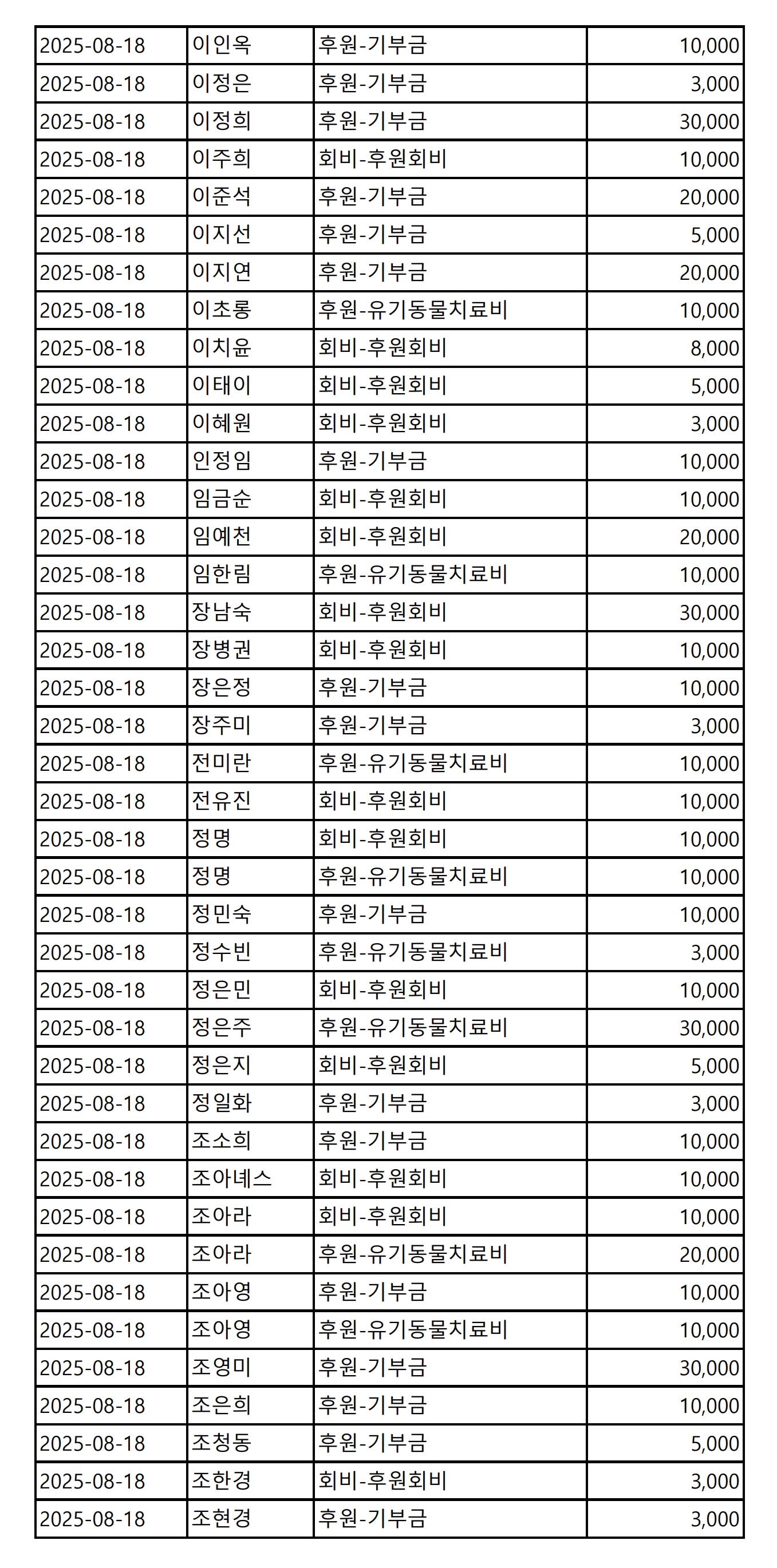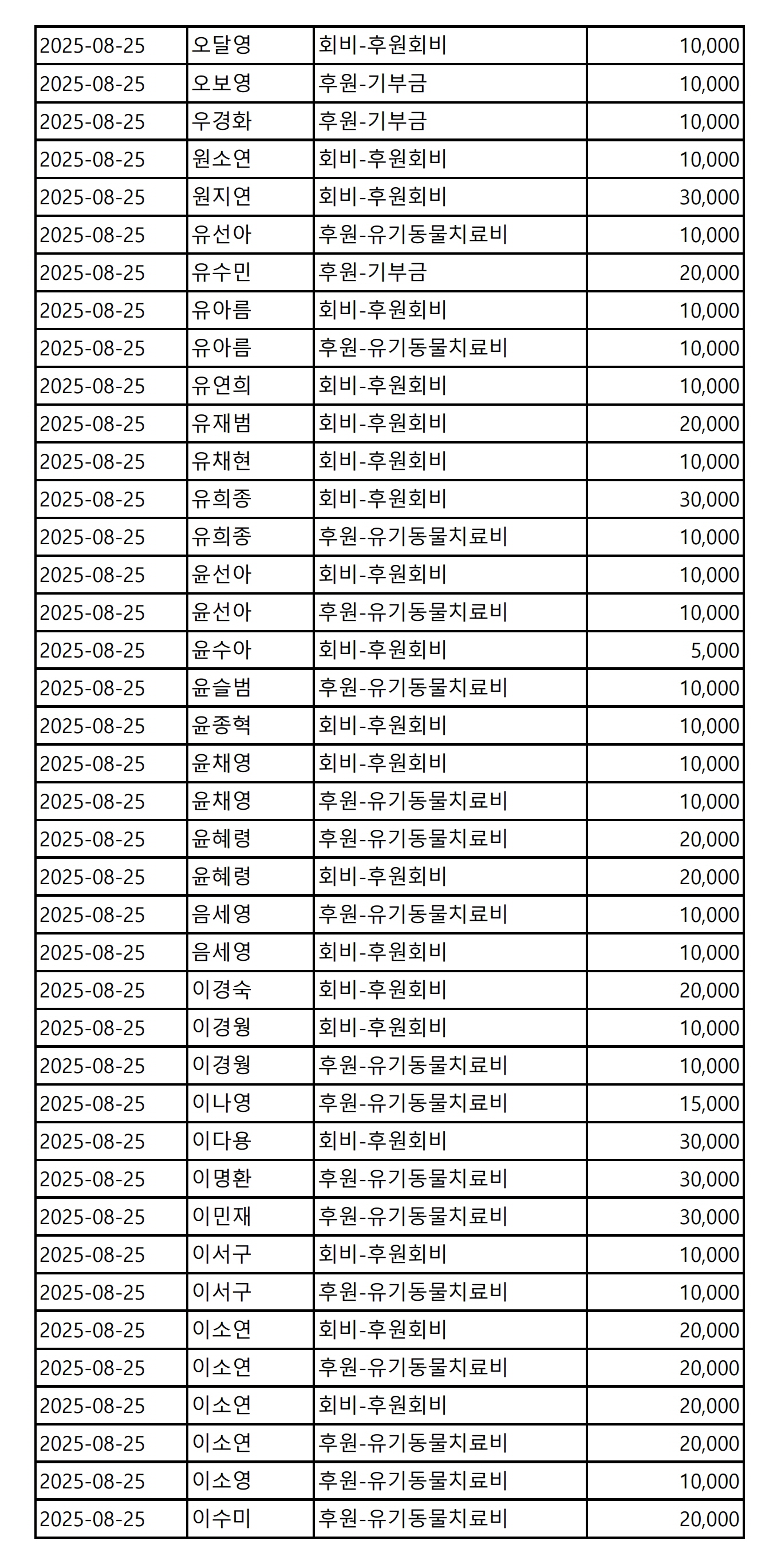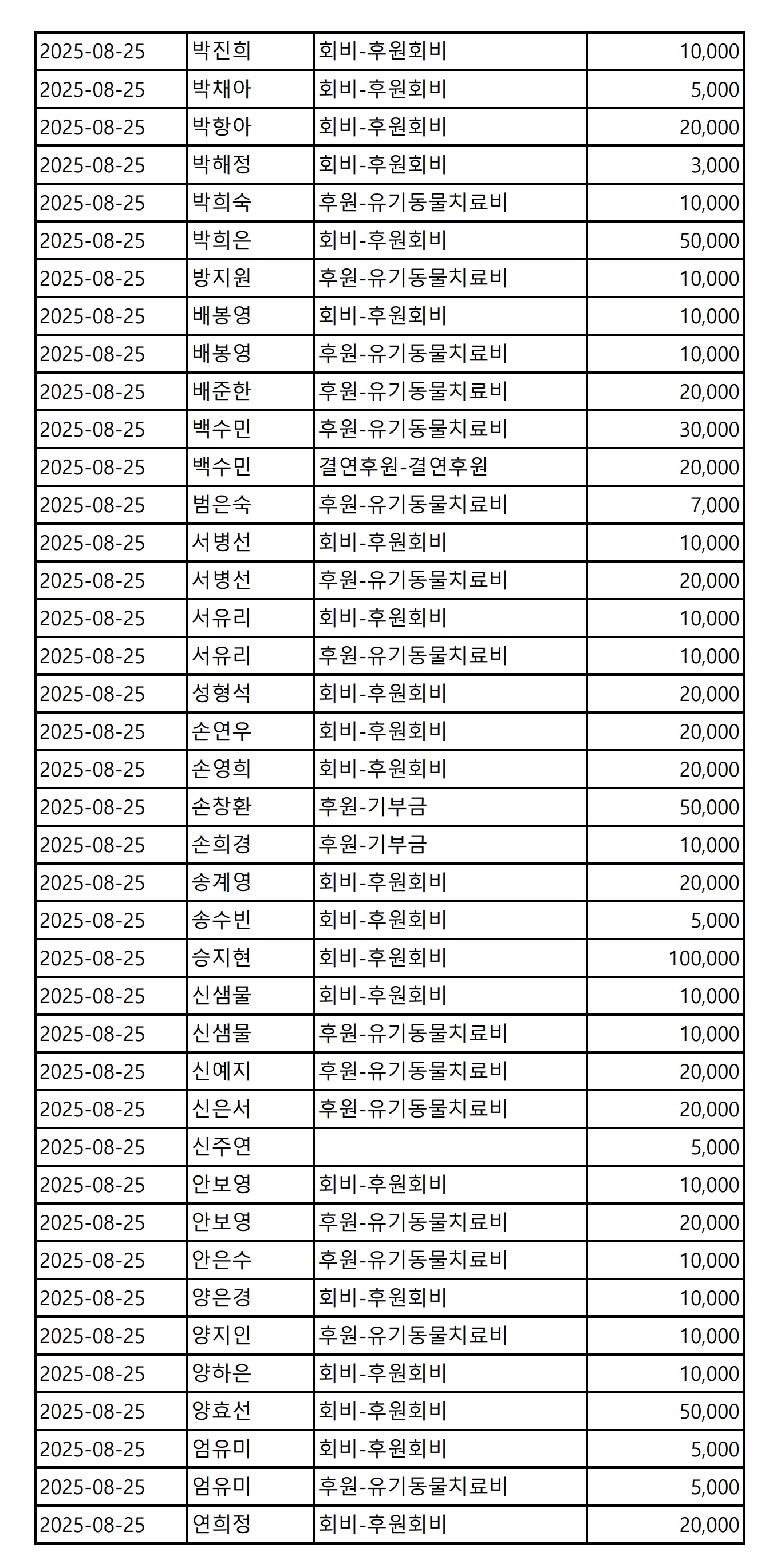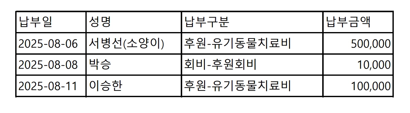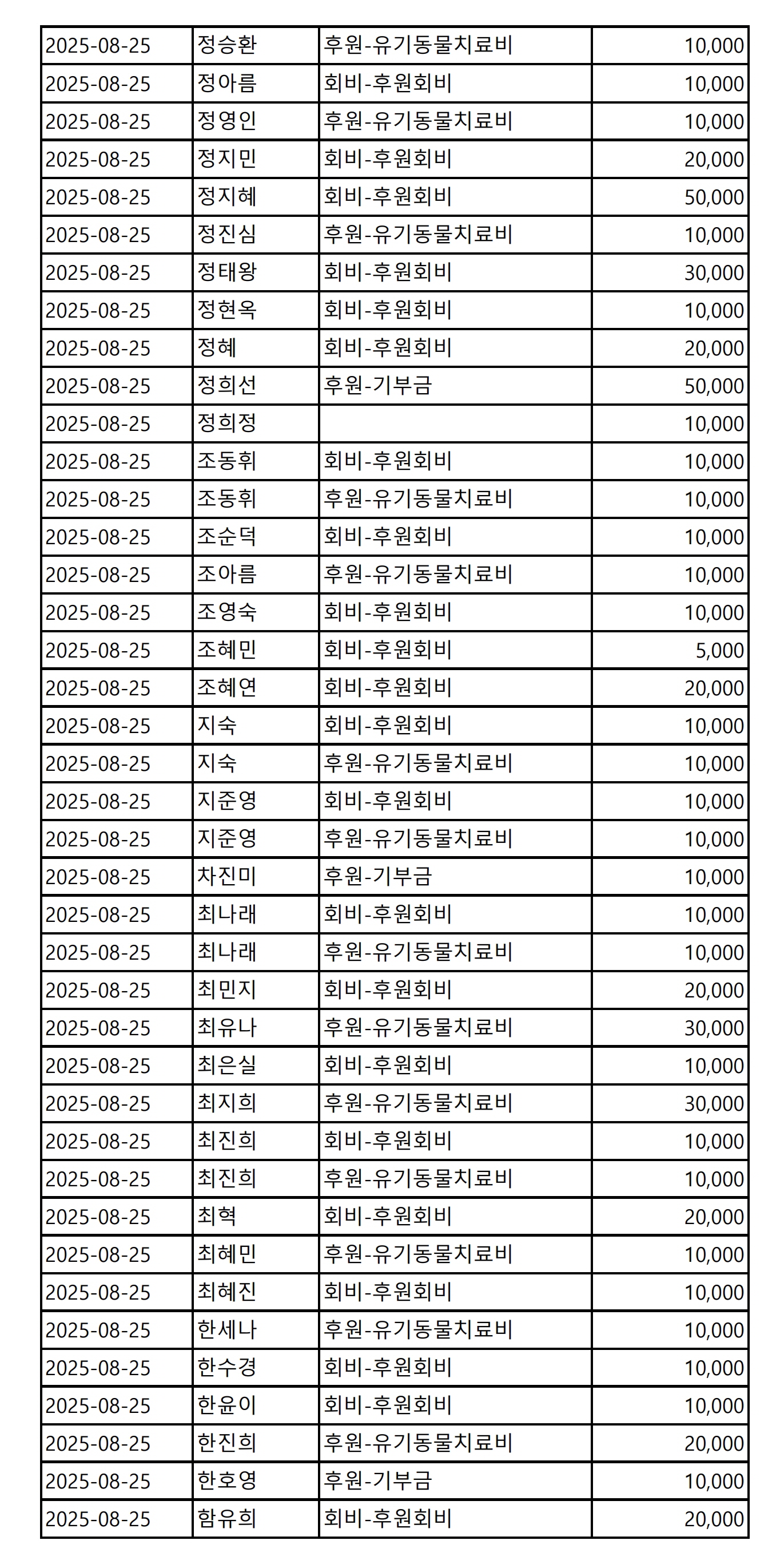 2025년 08월 CMS, 신용카드, 계좌입금을 이용한 정기, 일시후원 리스트