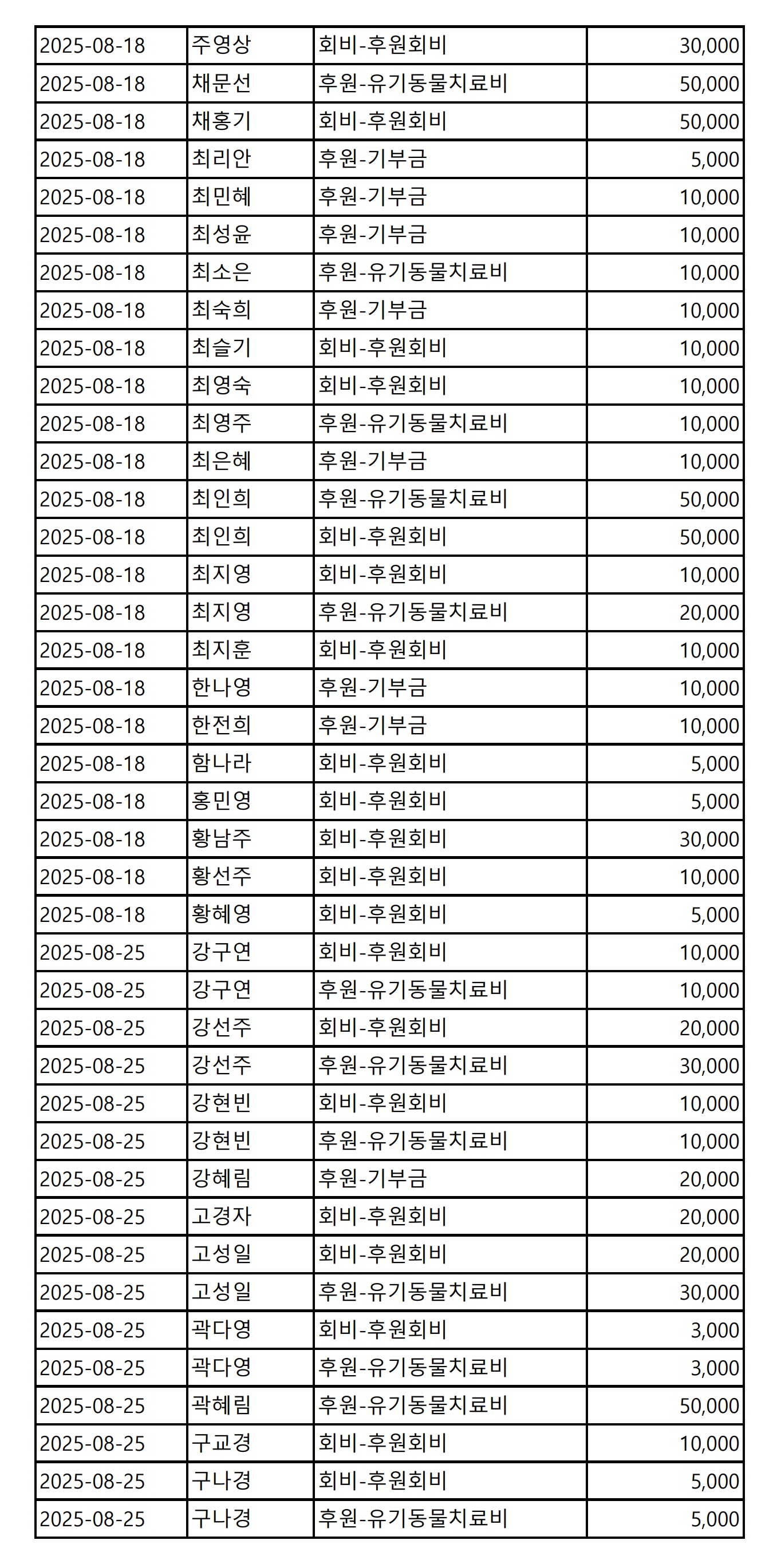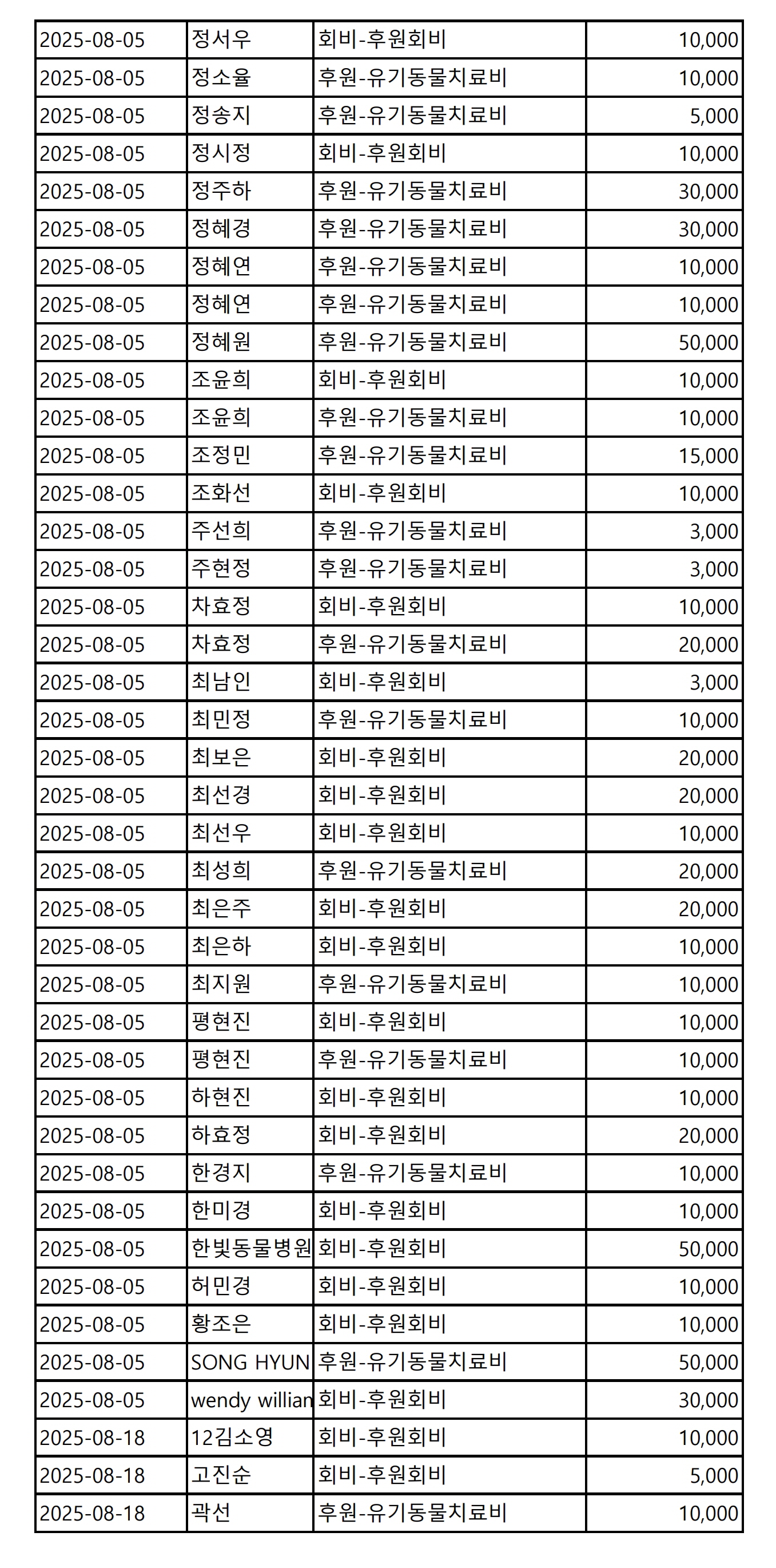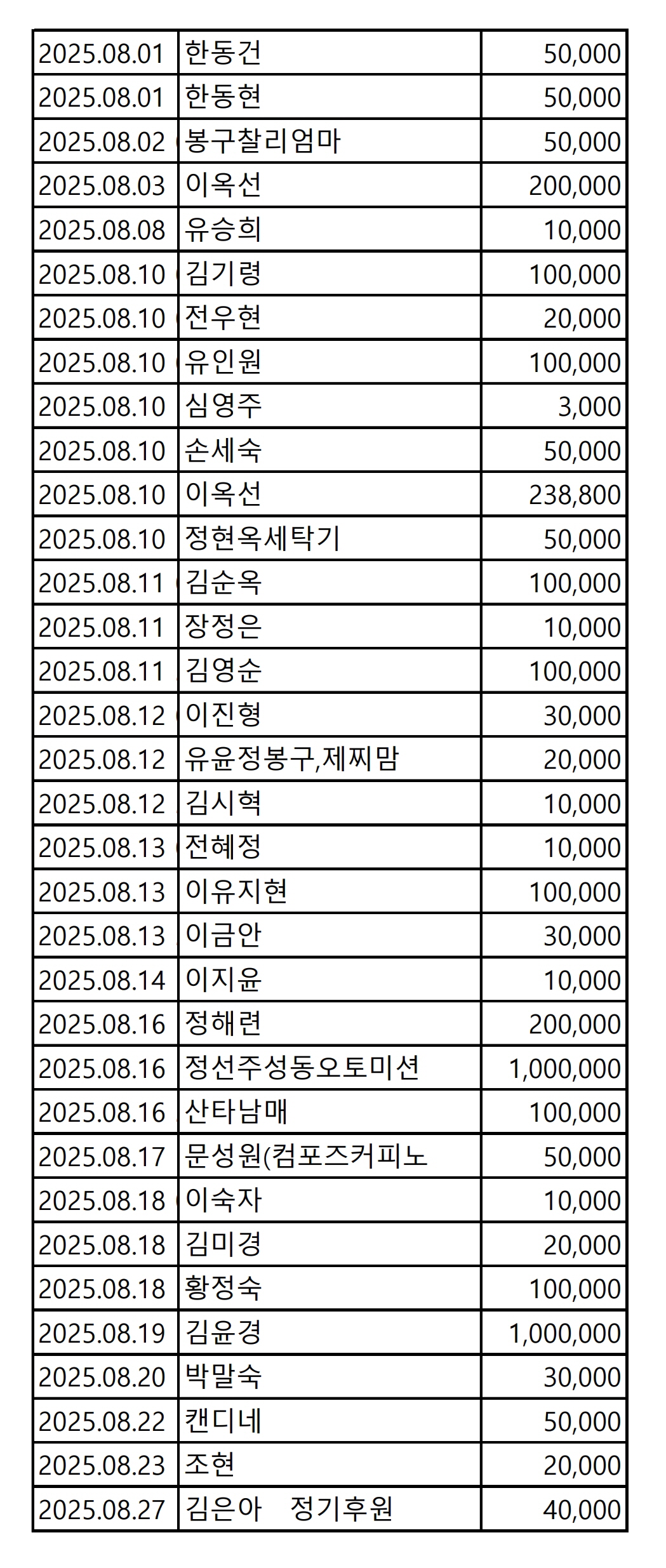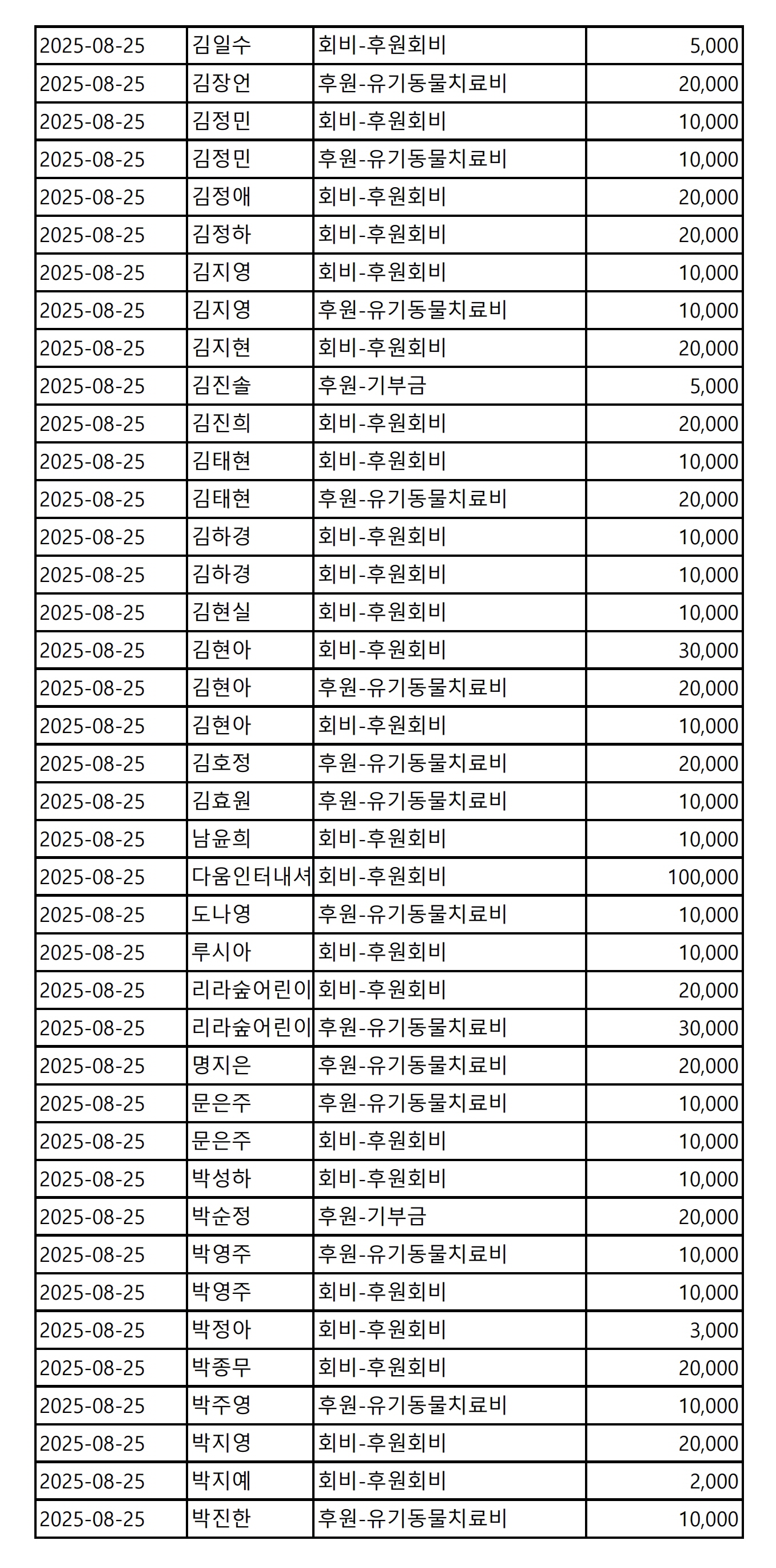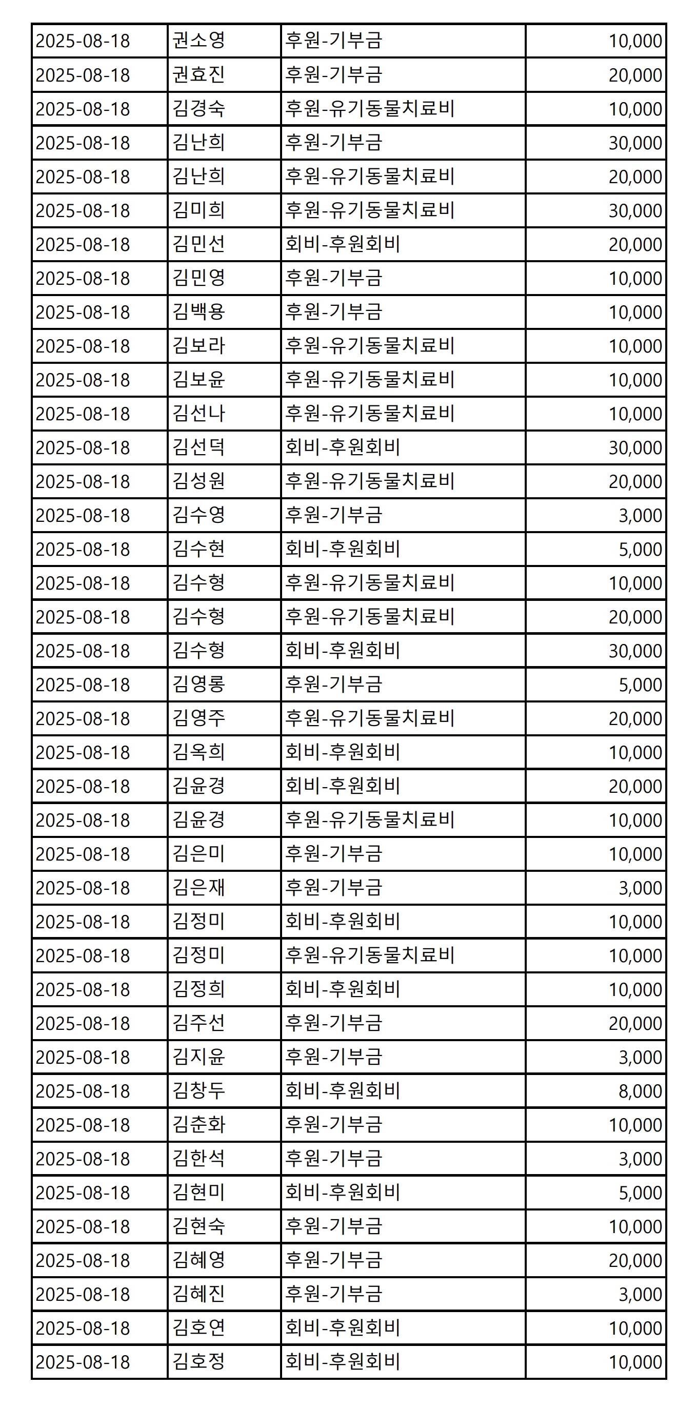 2025년 08월 CMS, 신용카드, 계좌입금을 이용한 정기, 일시후원 리스트