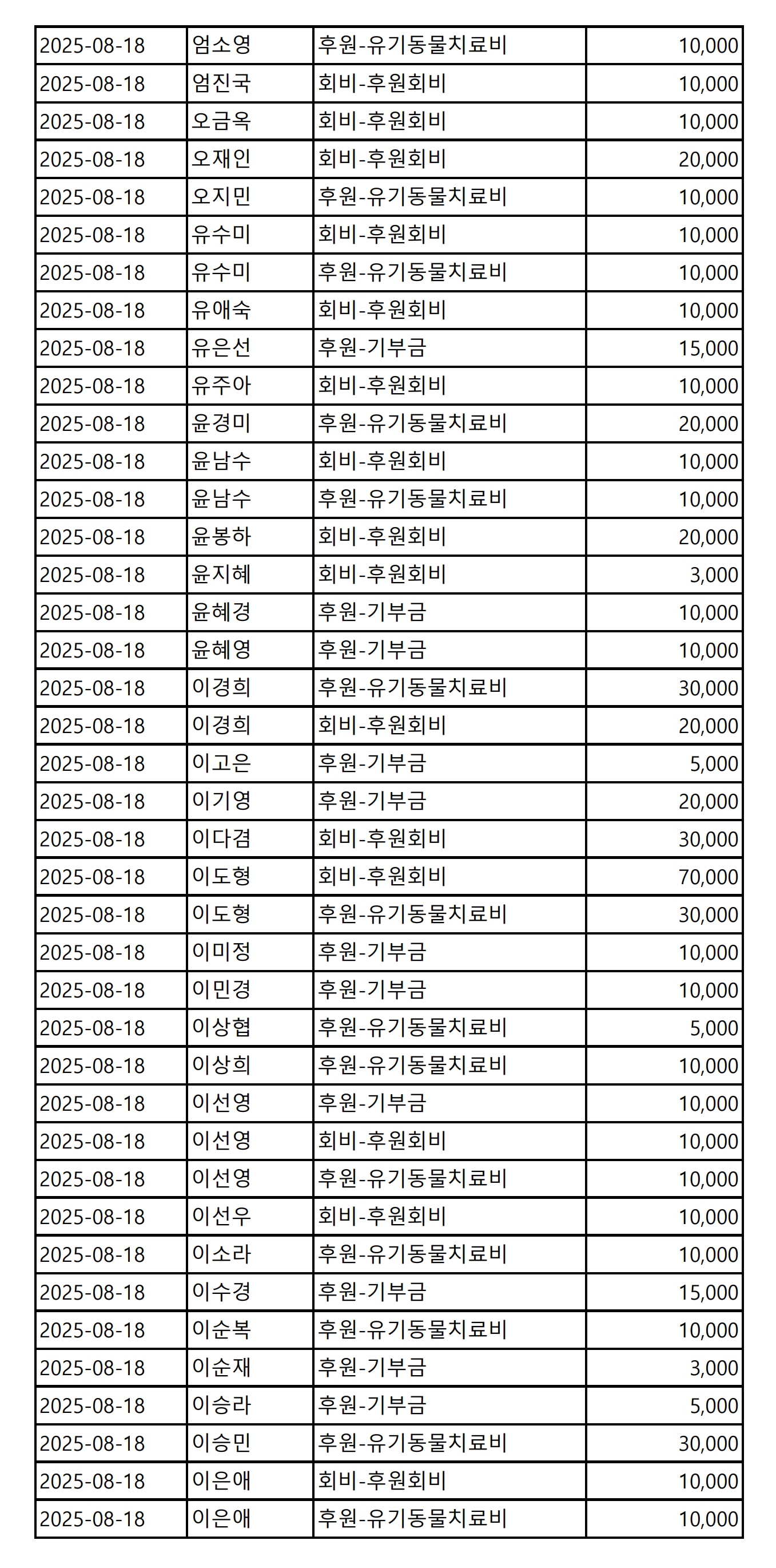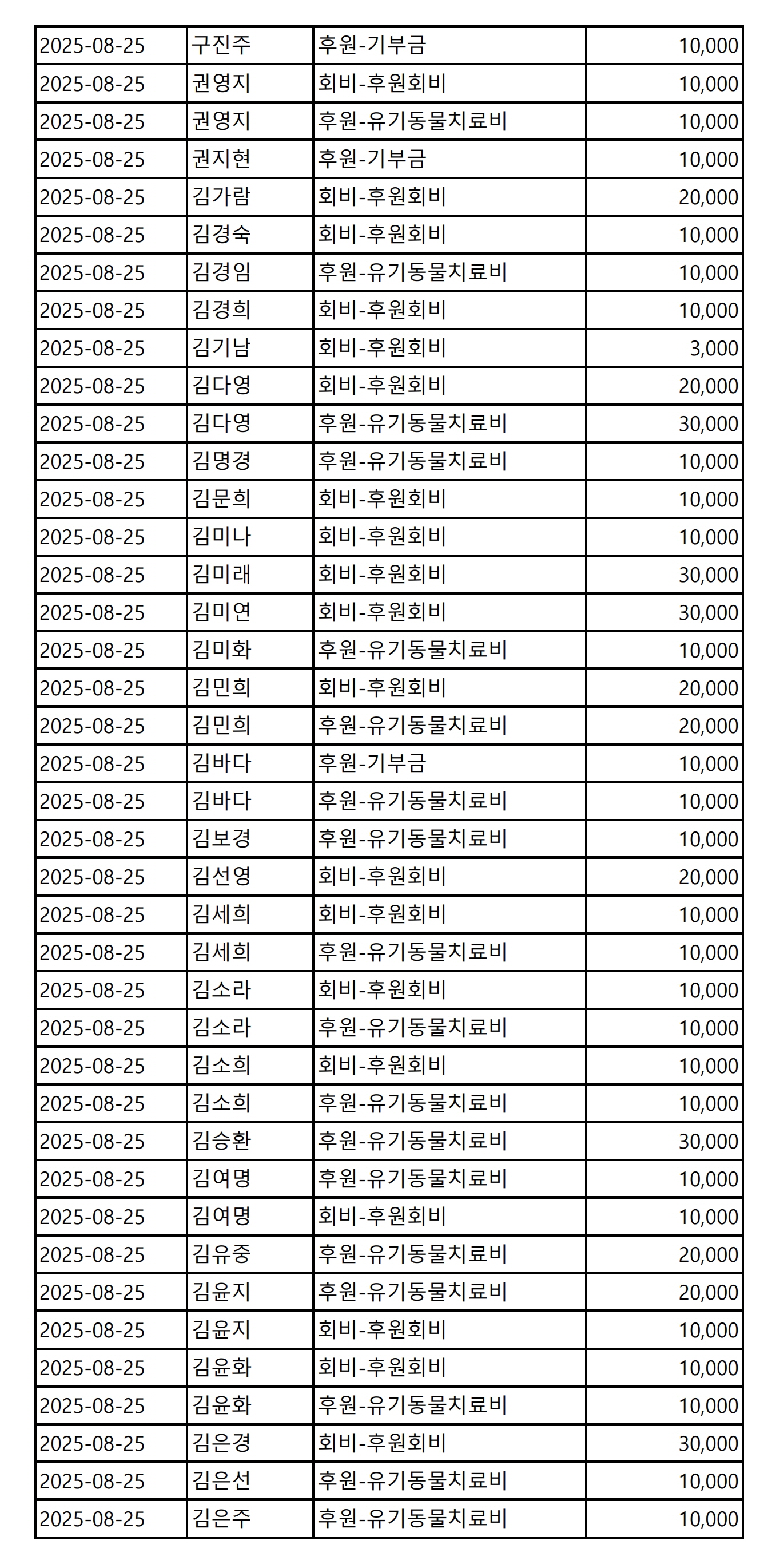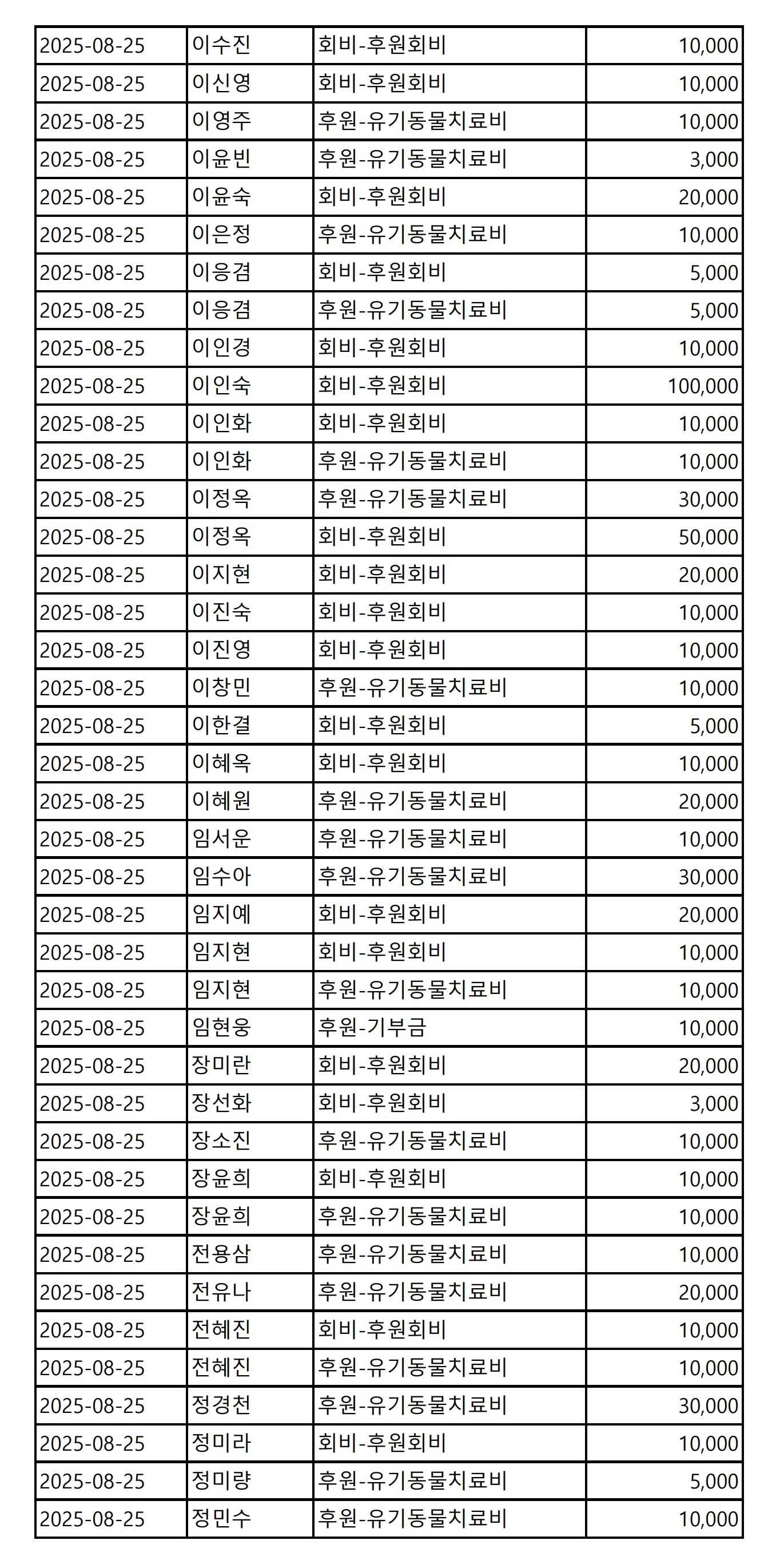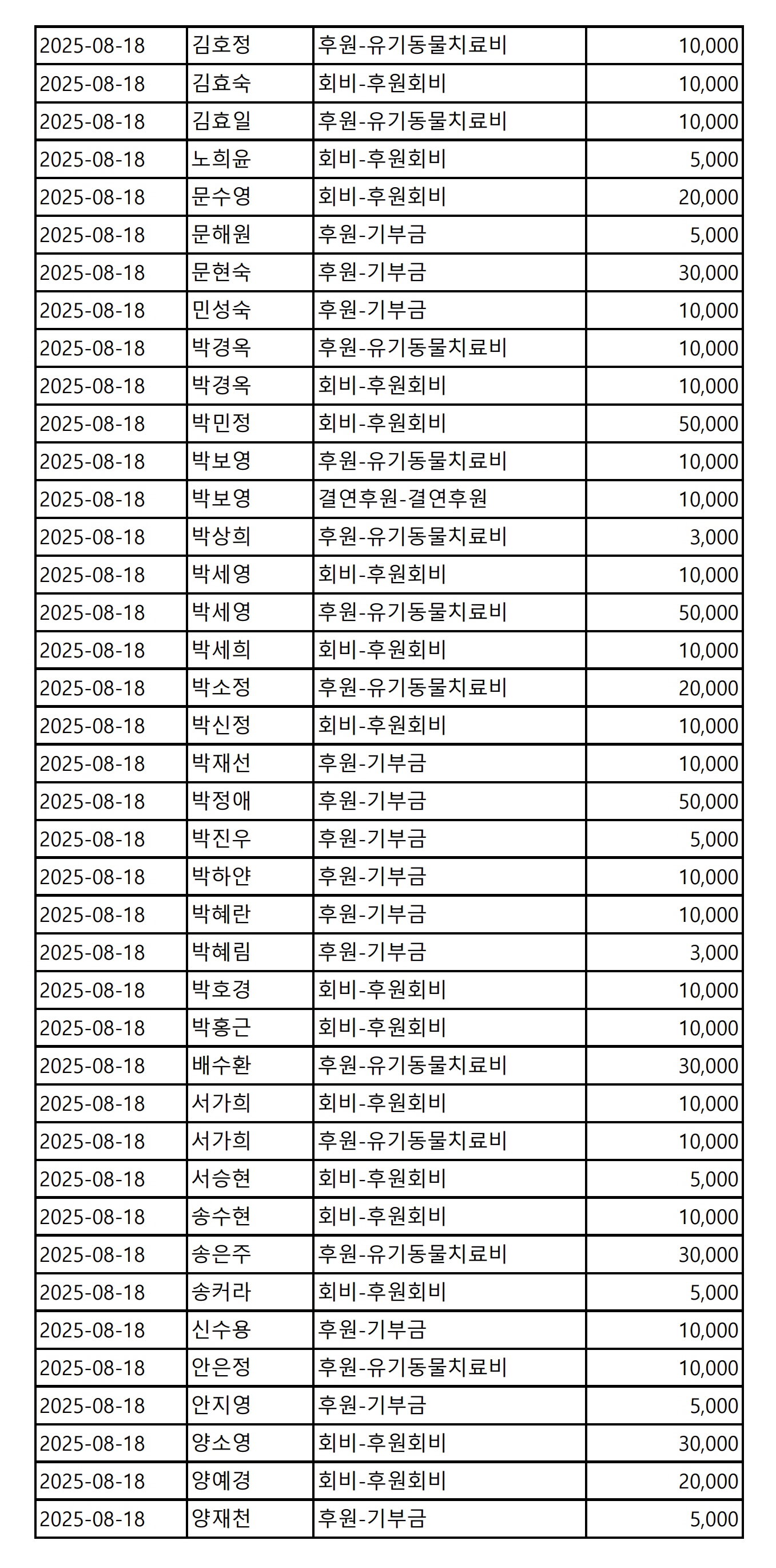 2025년 08월 CMS, 신용카드, 계좌입금을 이용한 정기, 일시후원 리스트