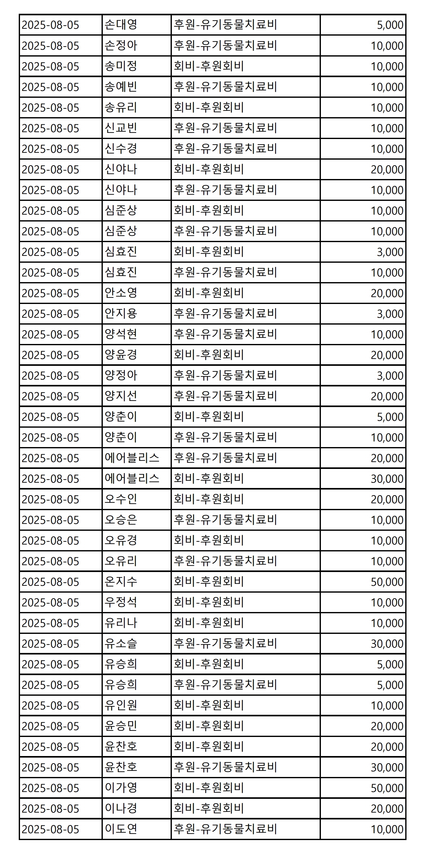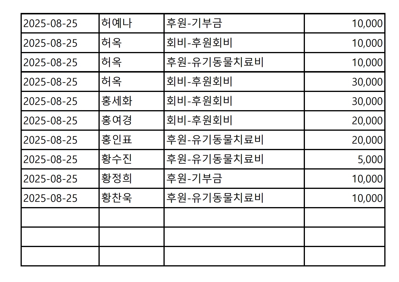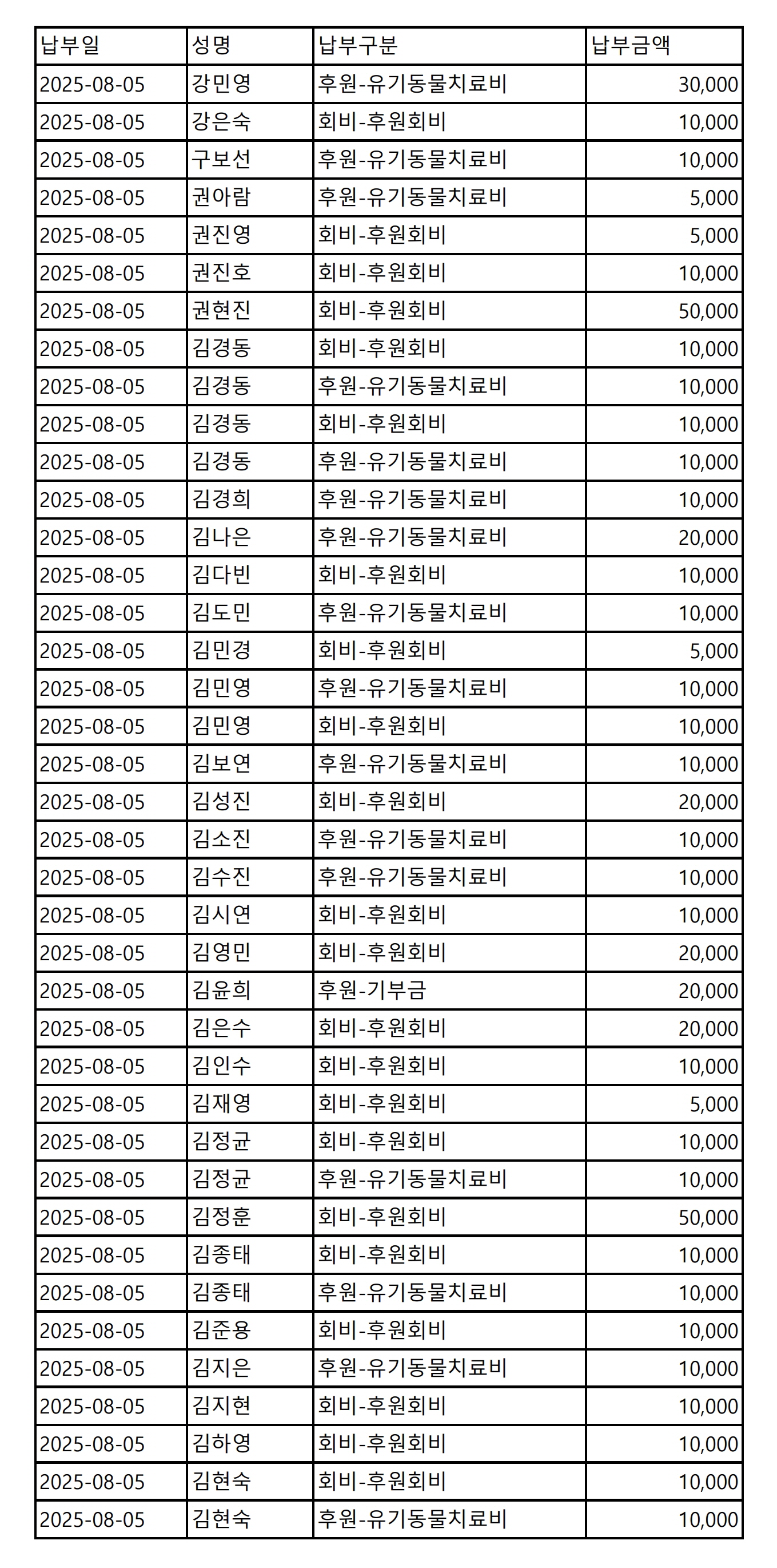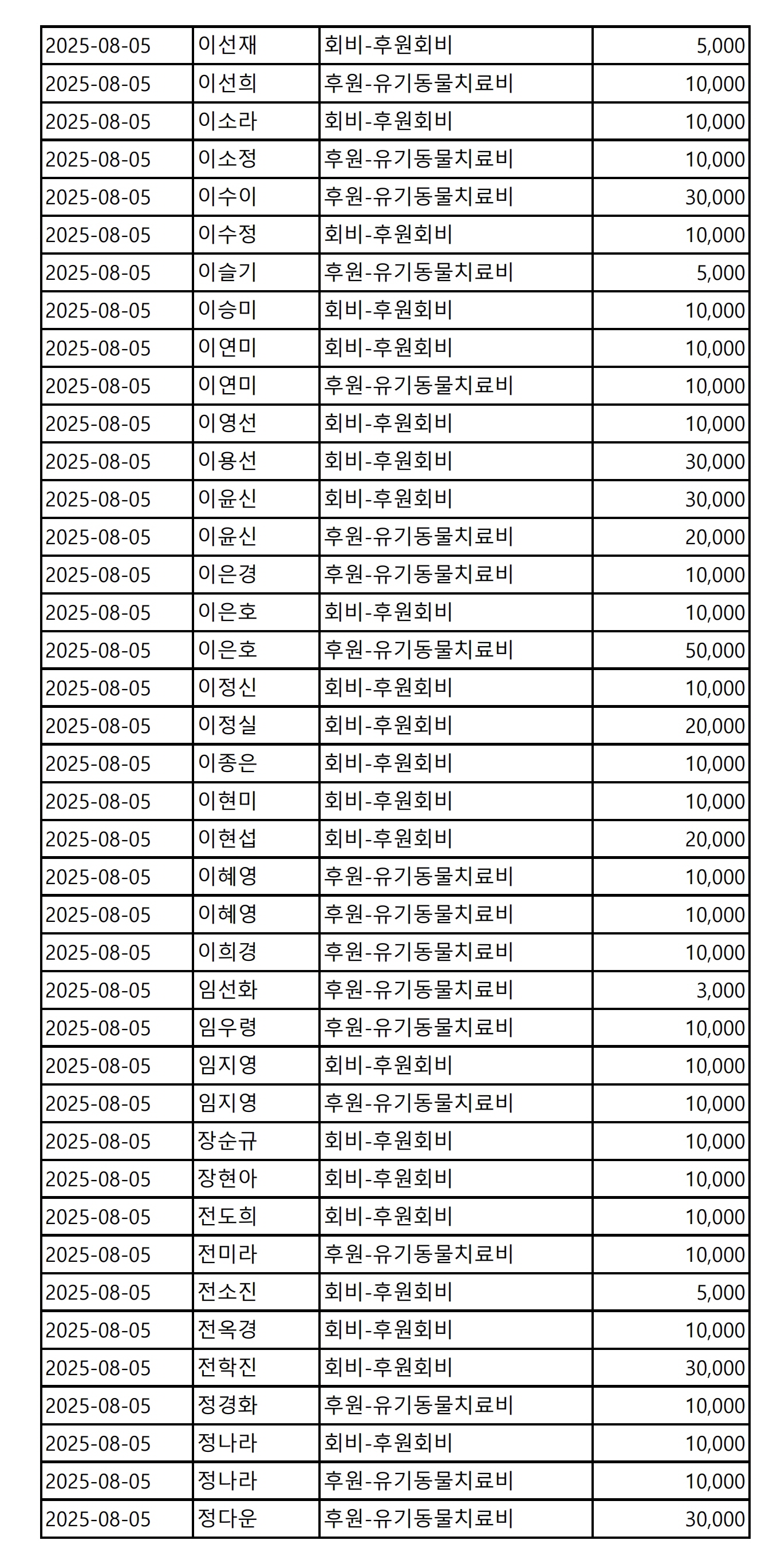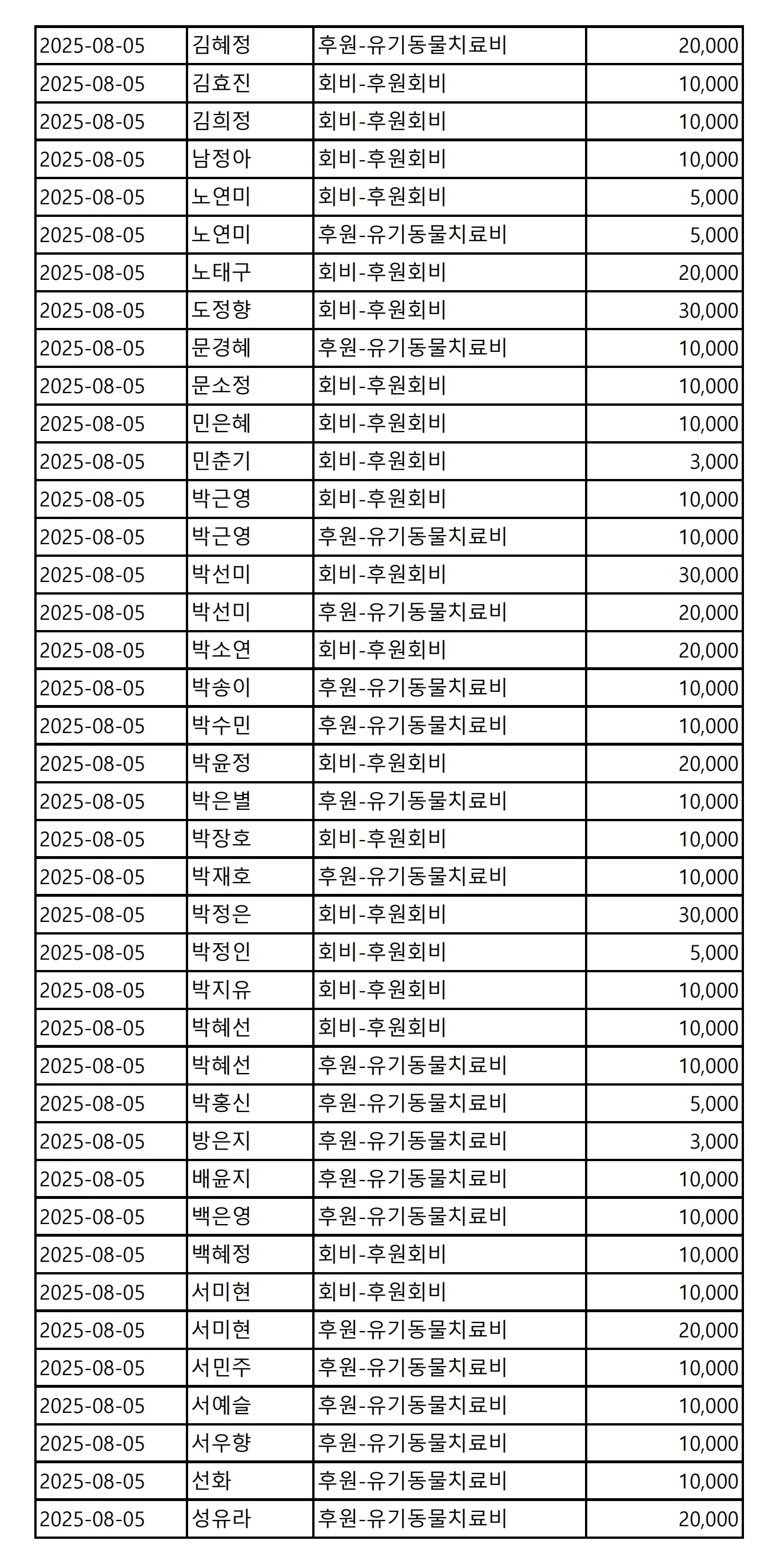 2025년 08월 CMS, 신용카드, 계좌입금을 이용한 정기, 일시후원 리스트