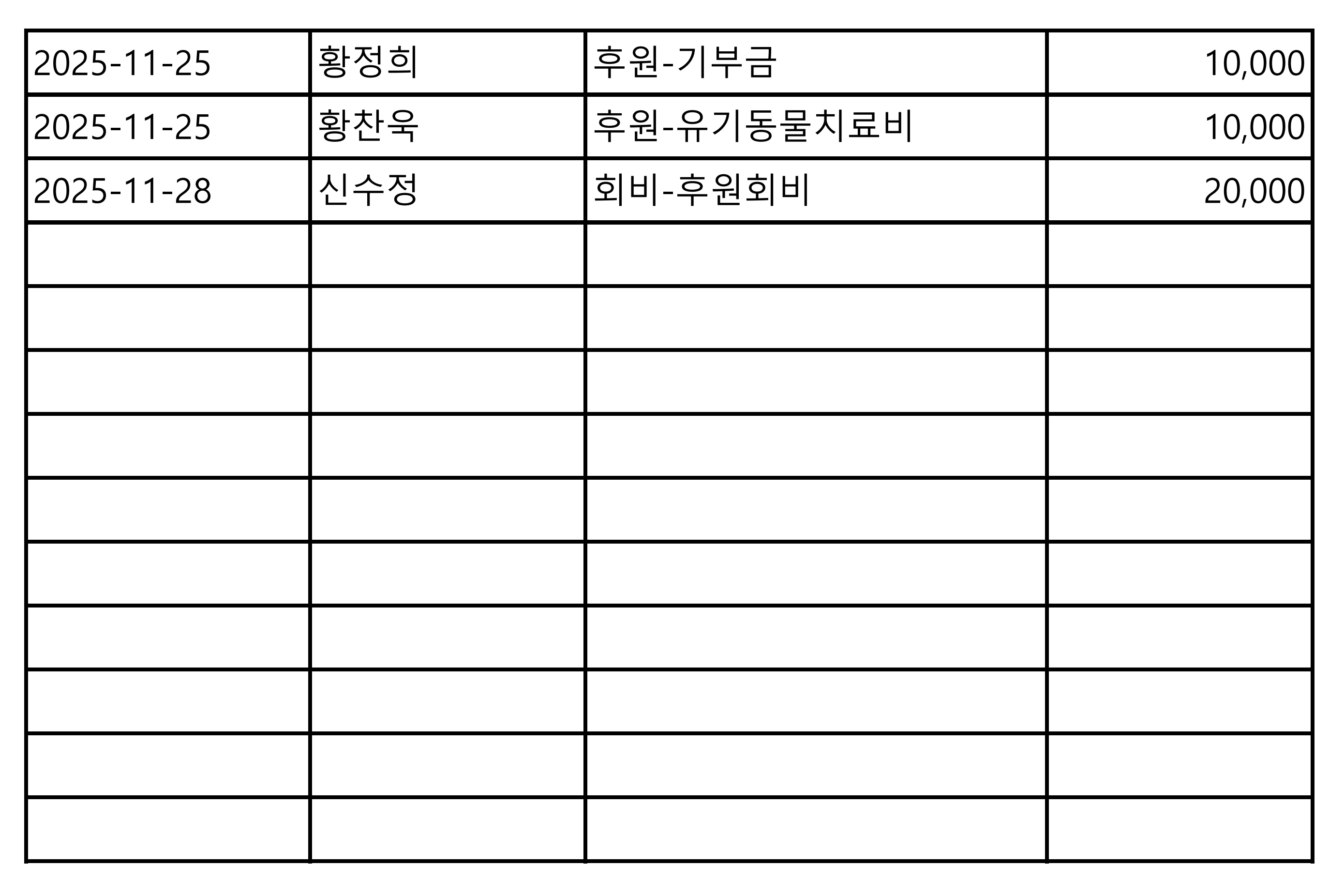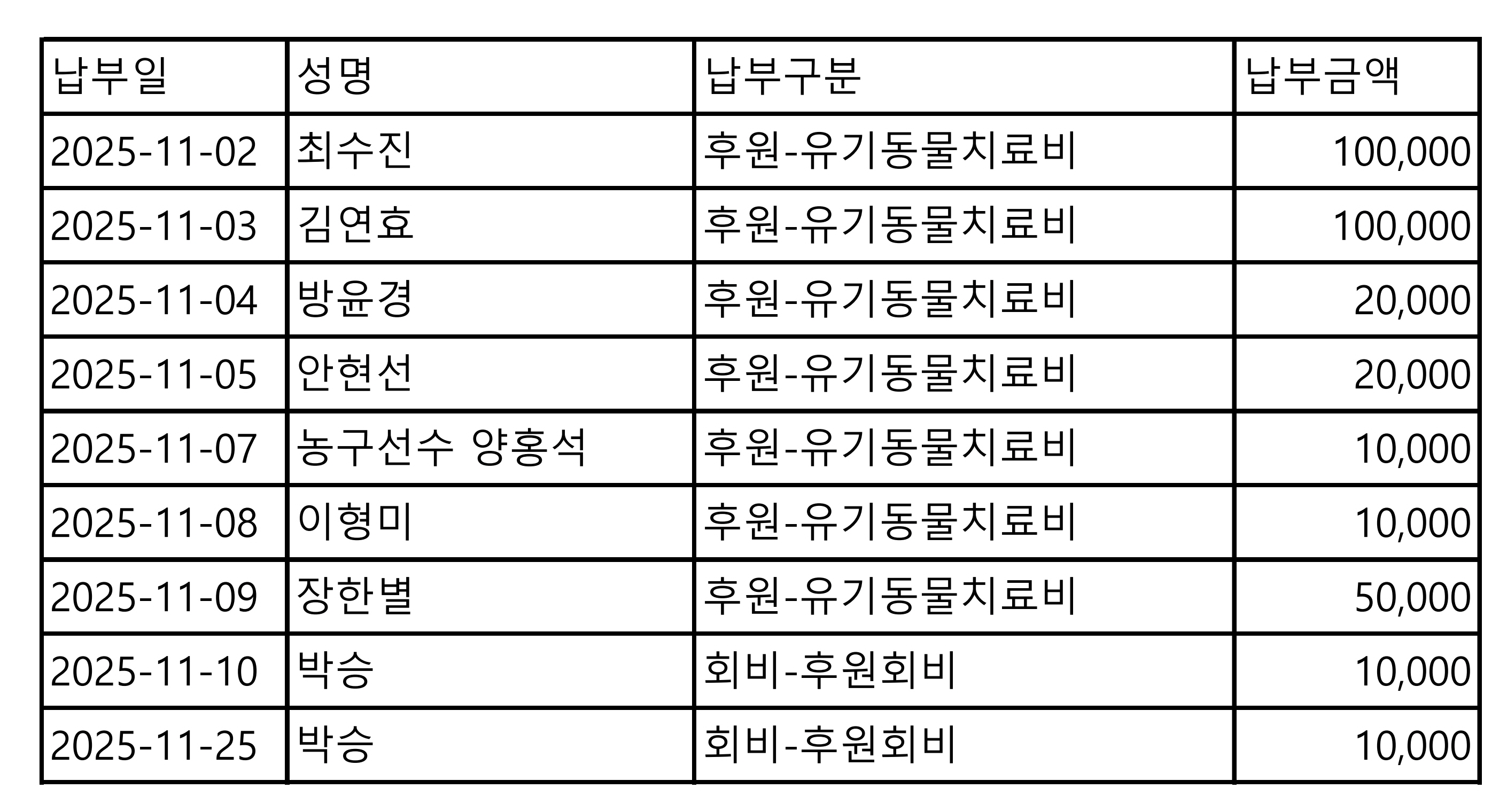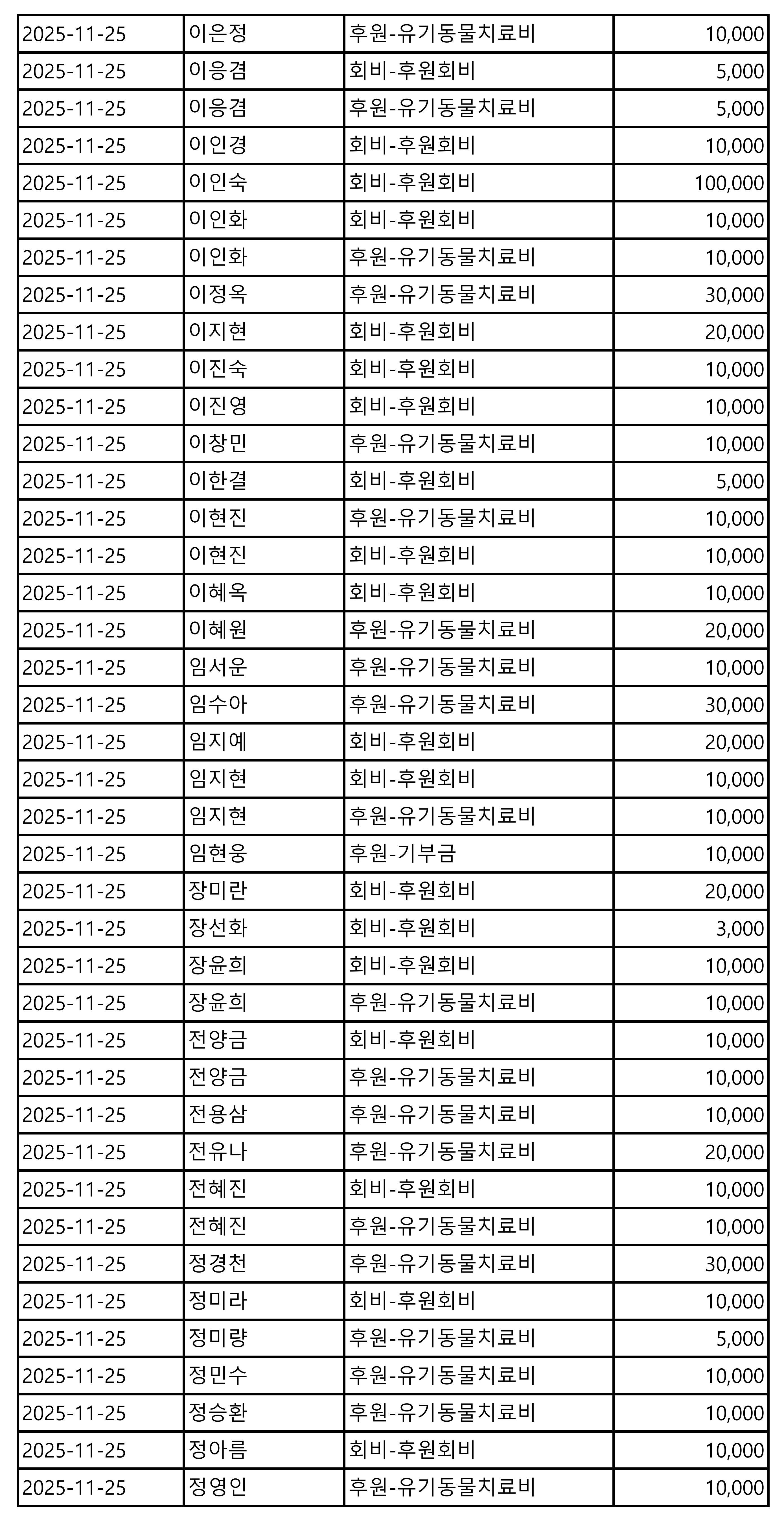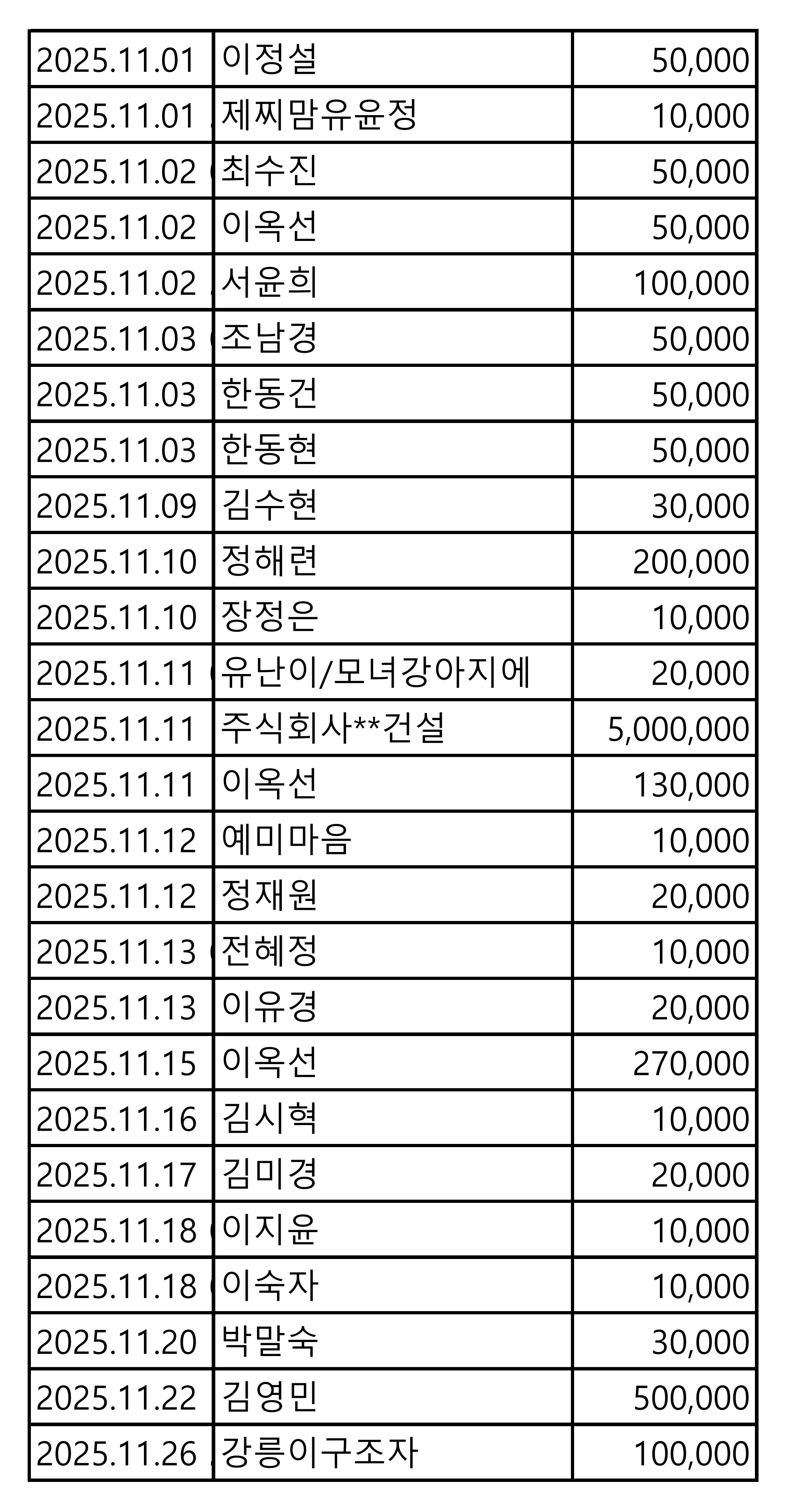 2025년 11월 CMS, 신용카드, 계좌입금을 이용한 정기, 일시후원 리스트