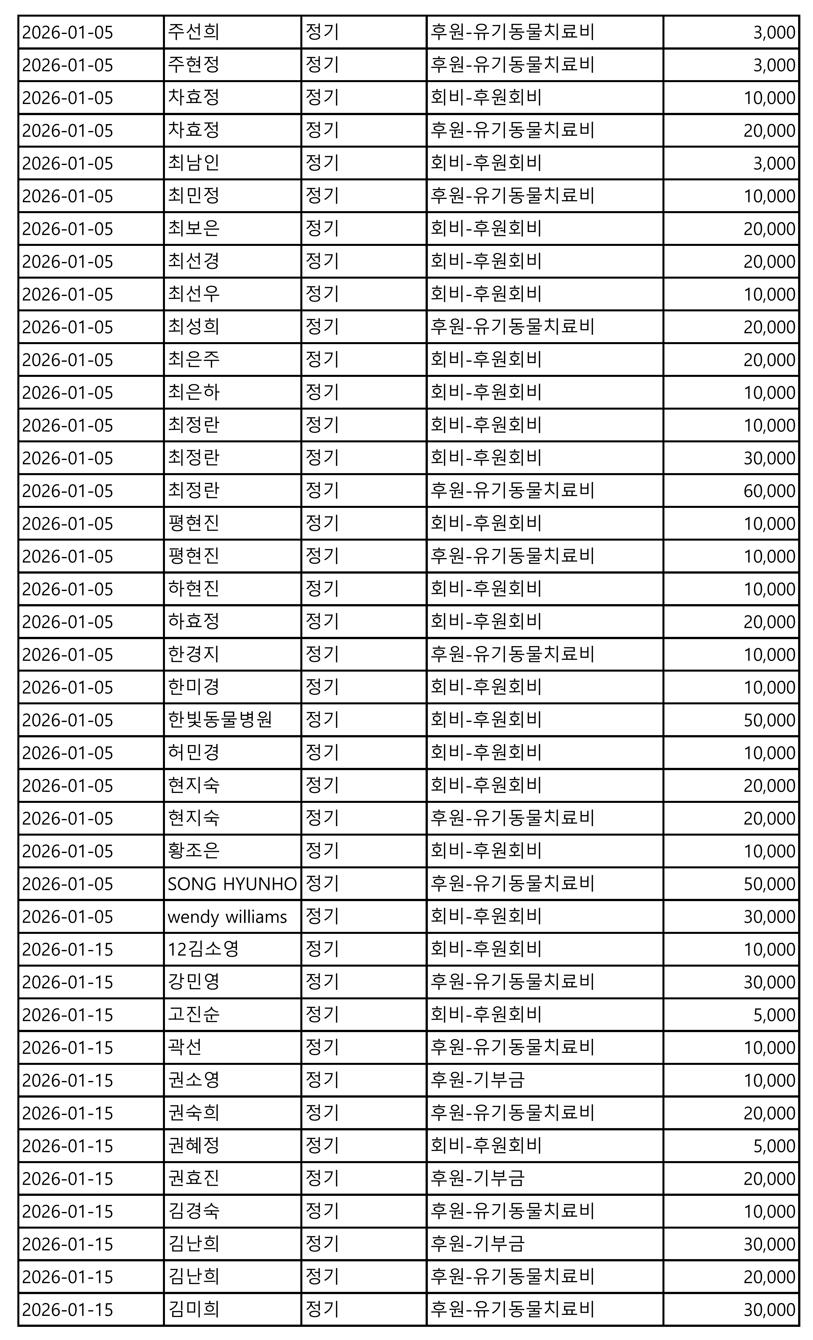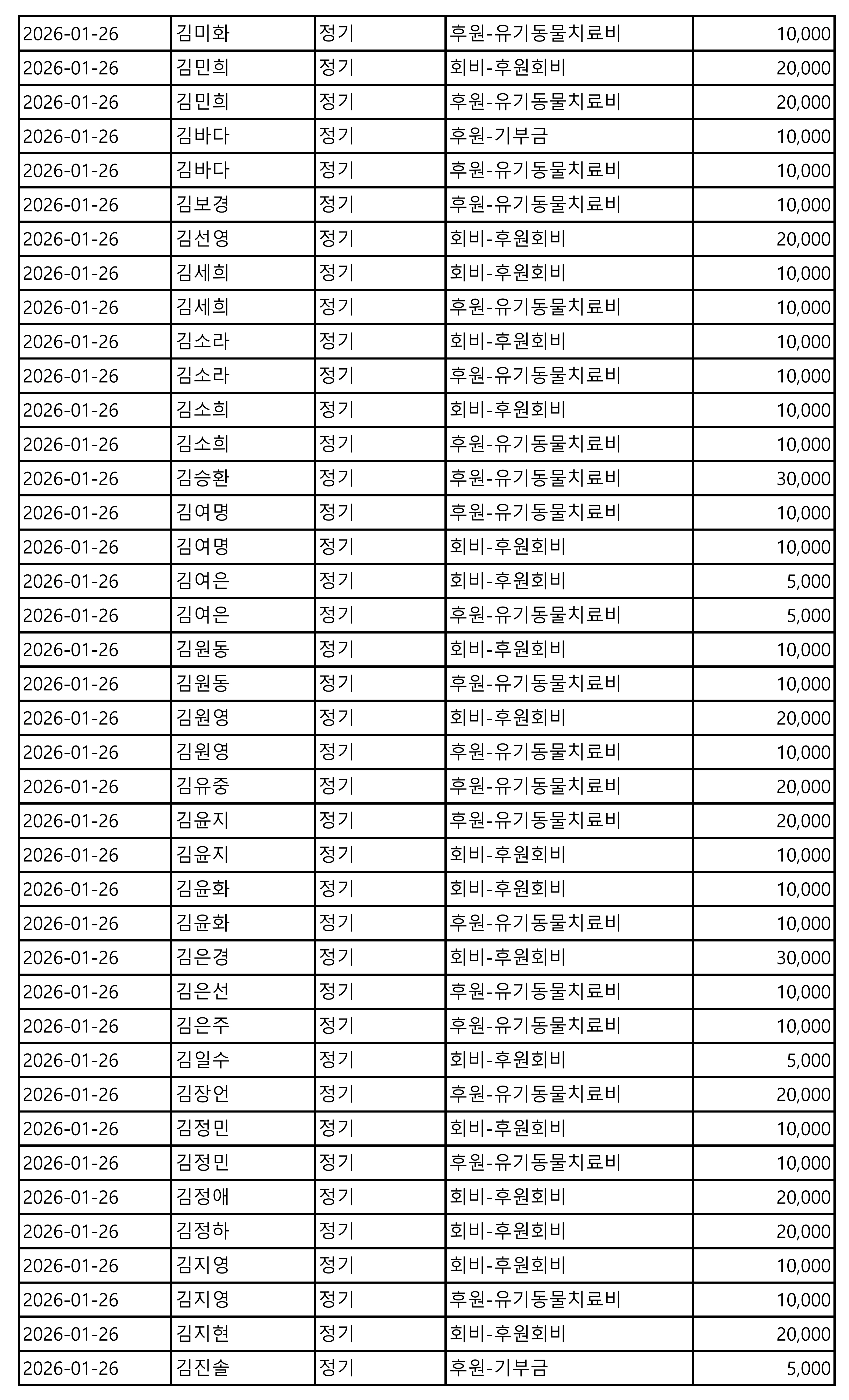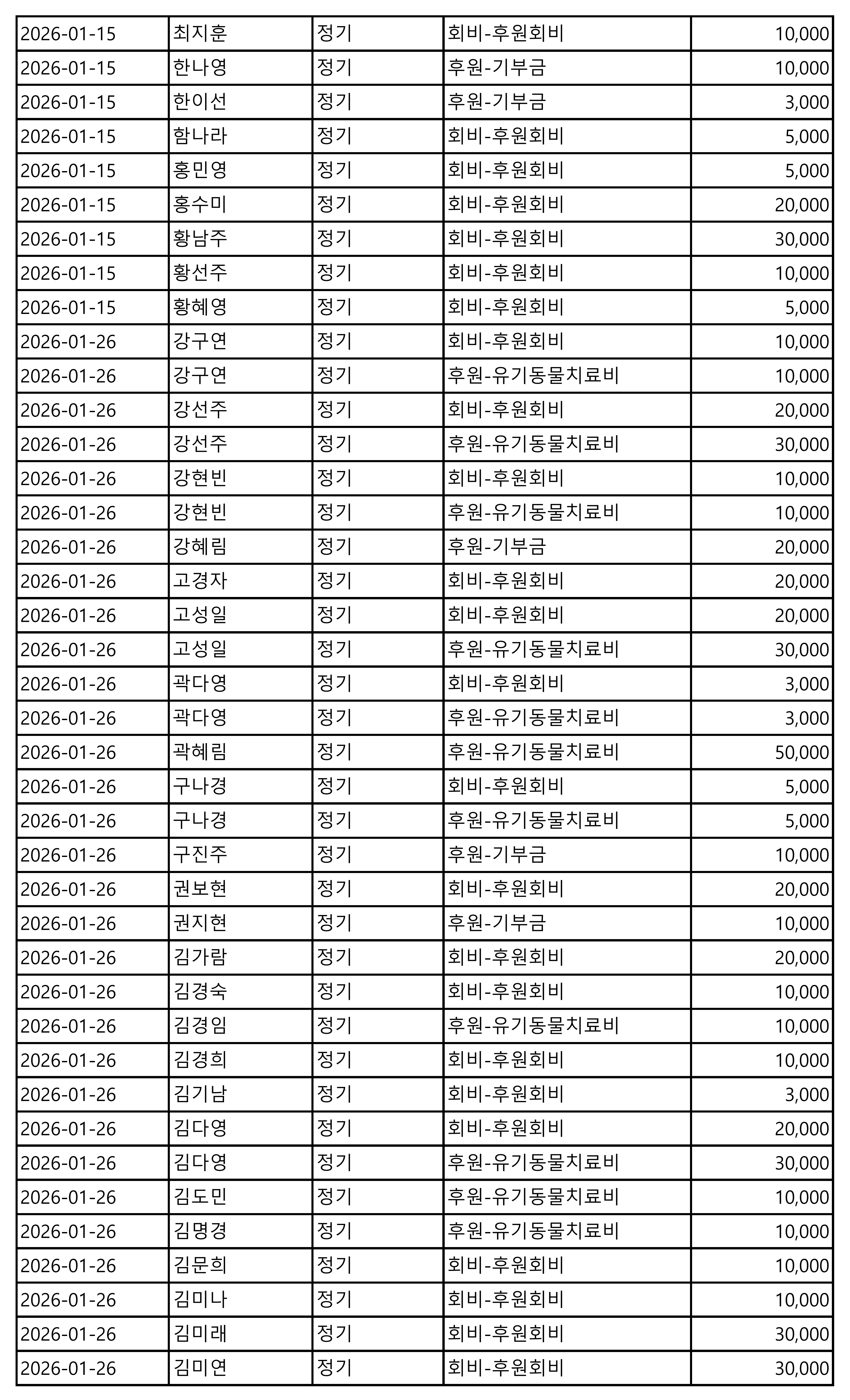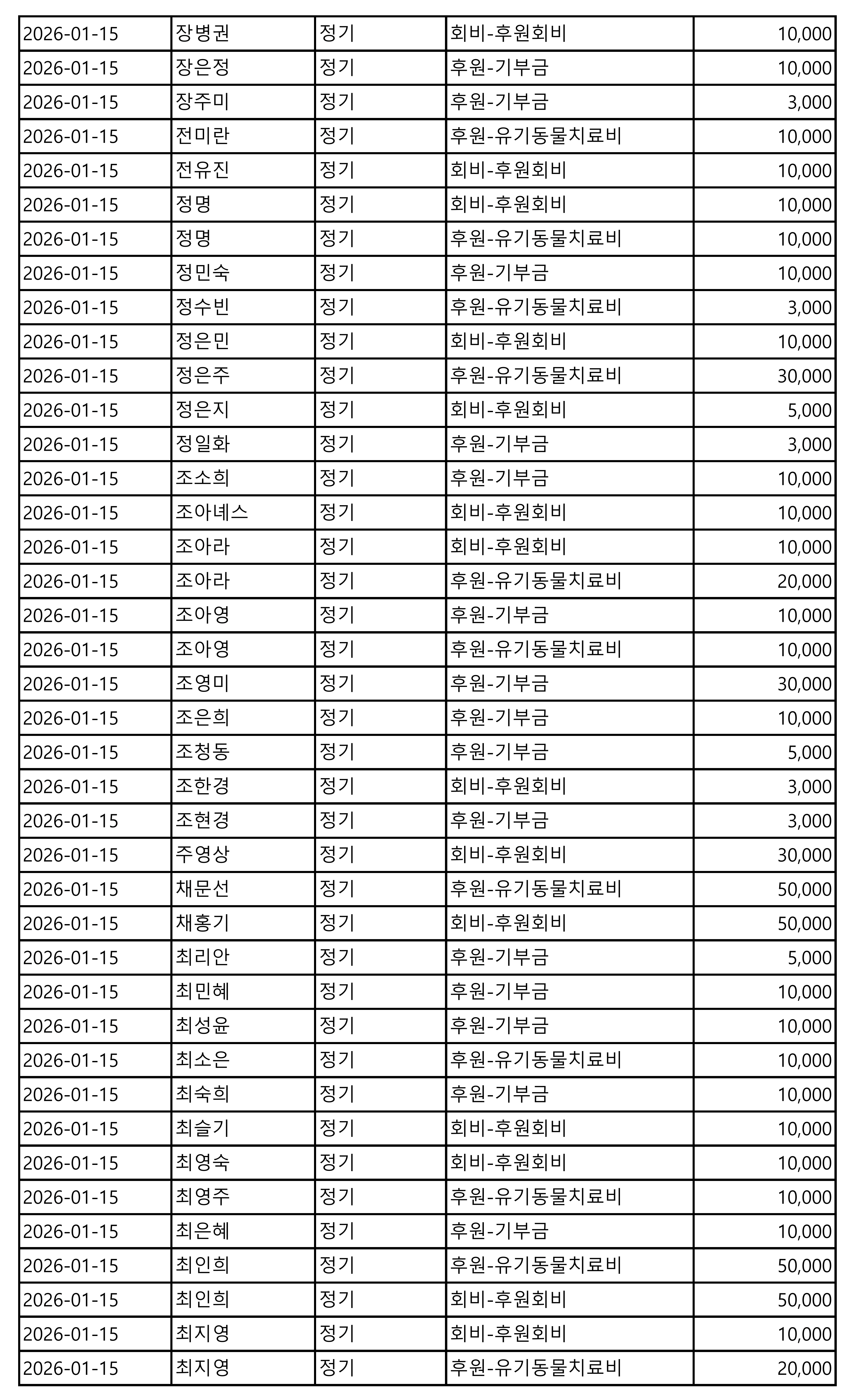 2026년 01월 CMS, 신용카드, 계좌입금을 이용한 정기, 일시후원 리스트