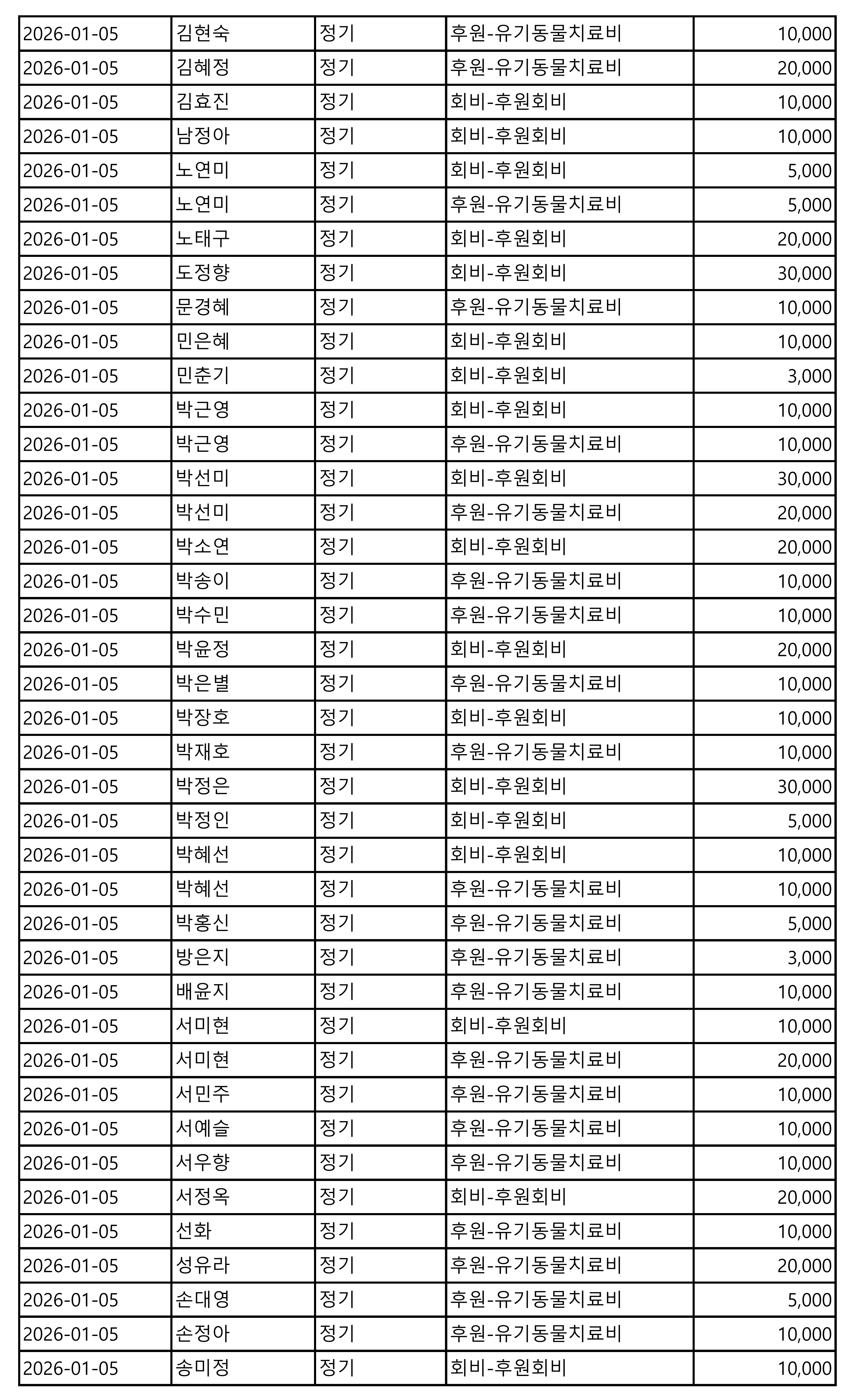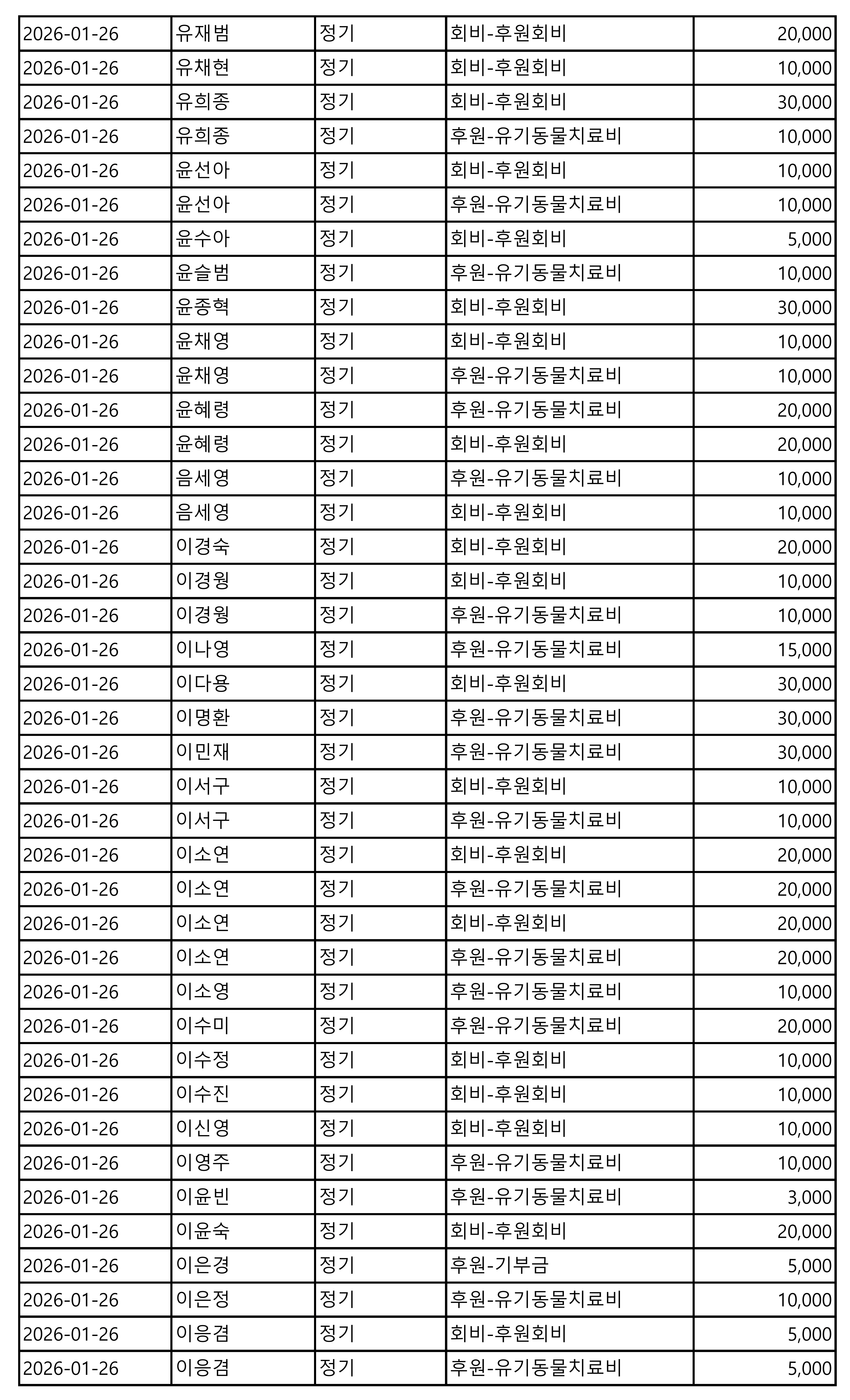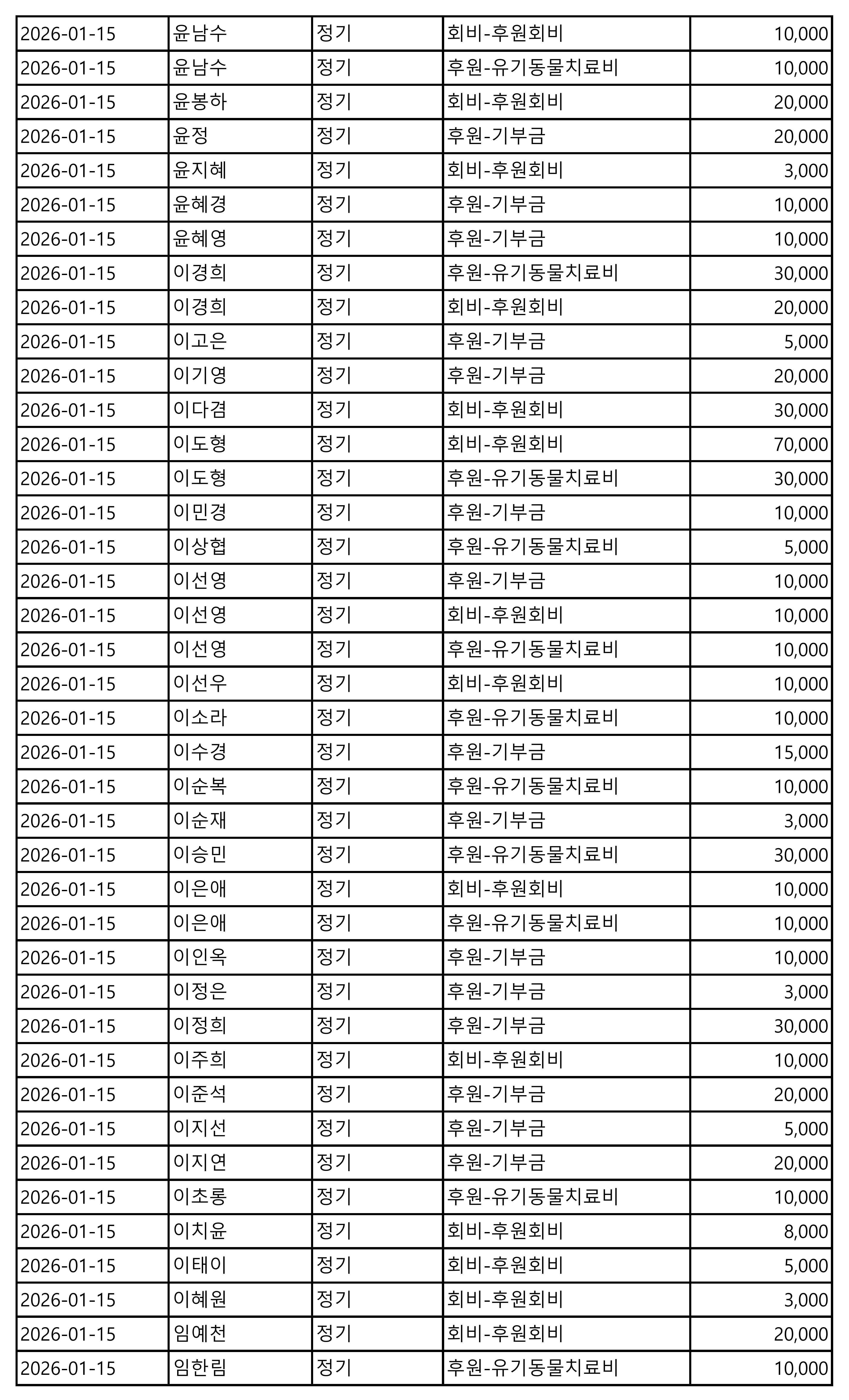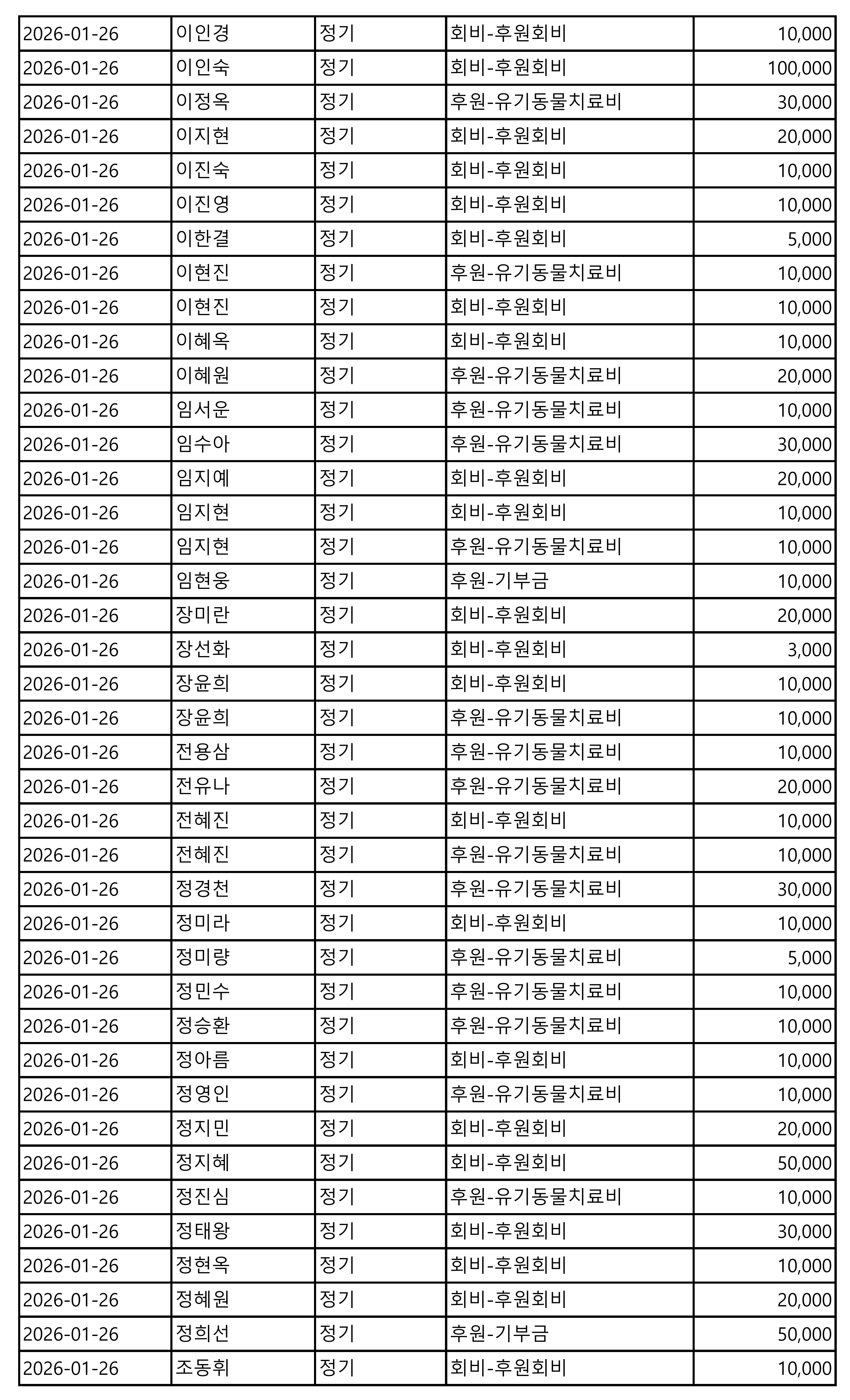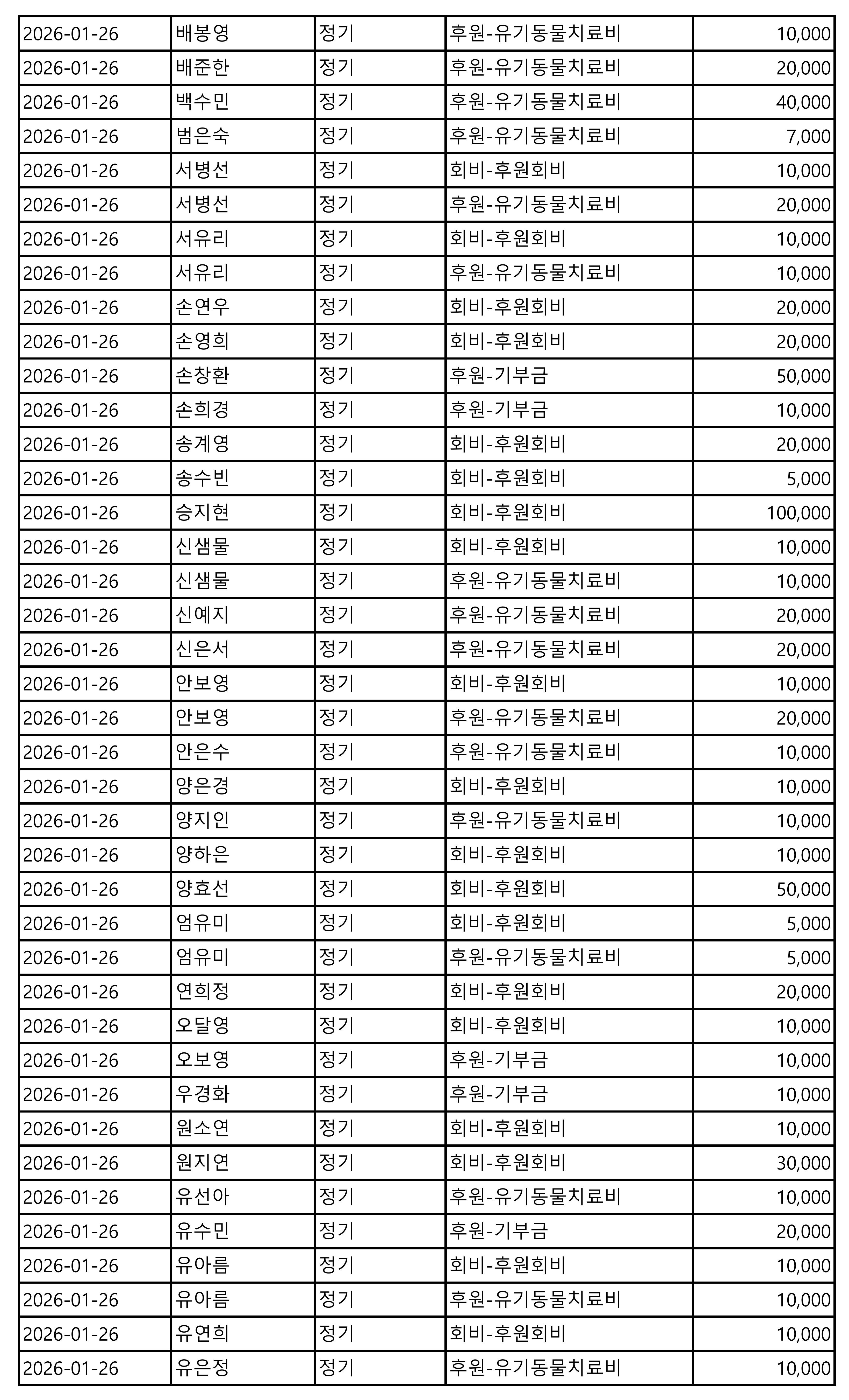 2026년 01월 CMS, 신용카드, 계좌입금을 이용한 정기, 일시후원 리스트