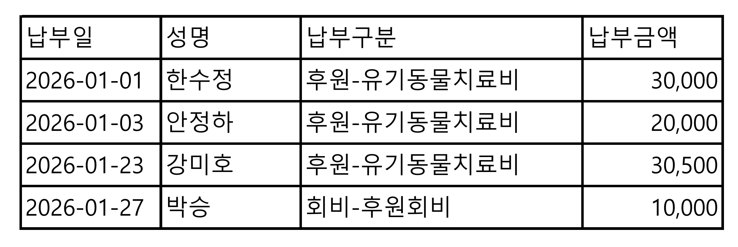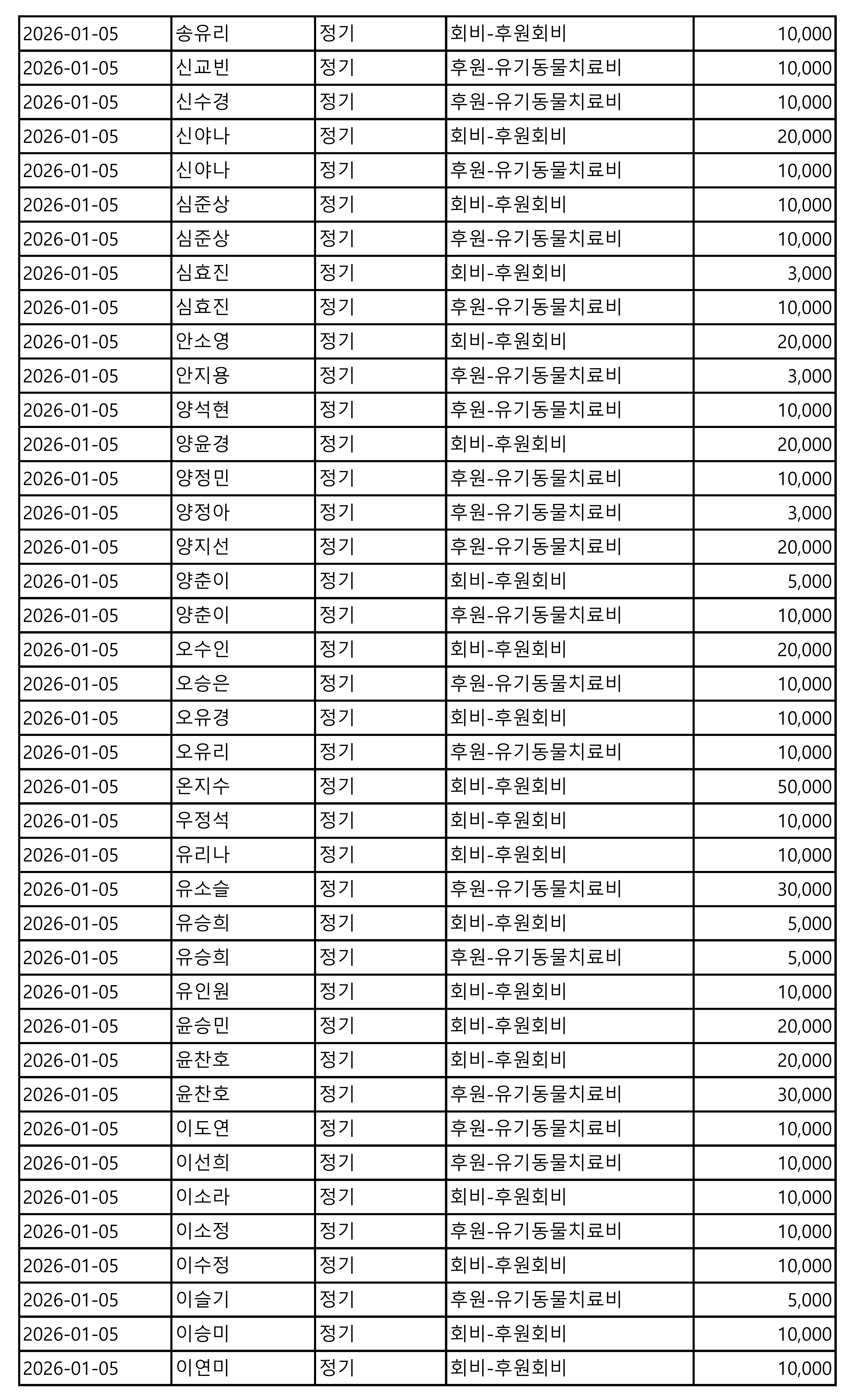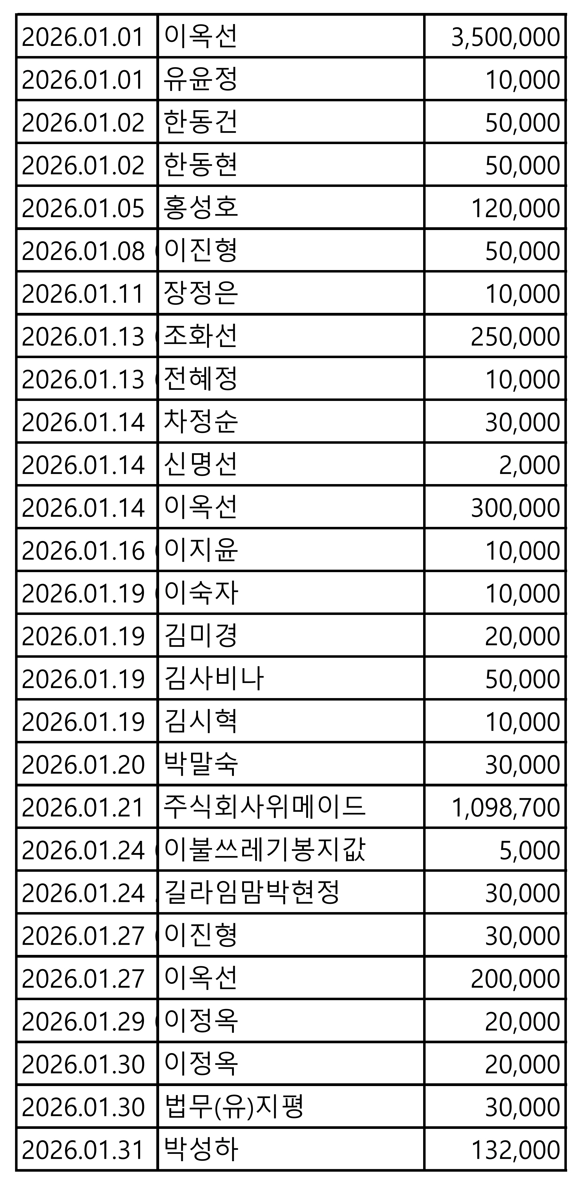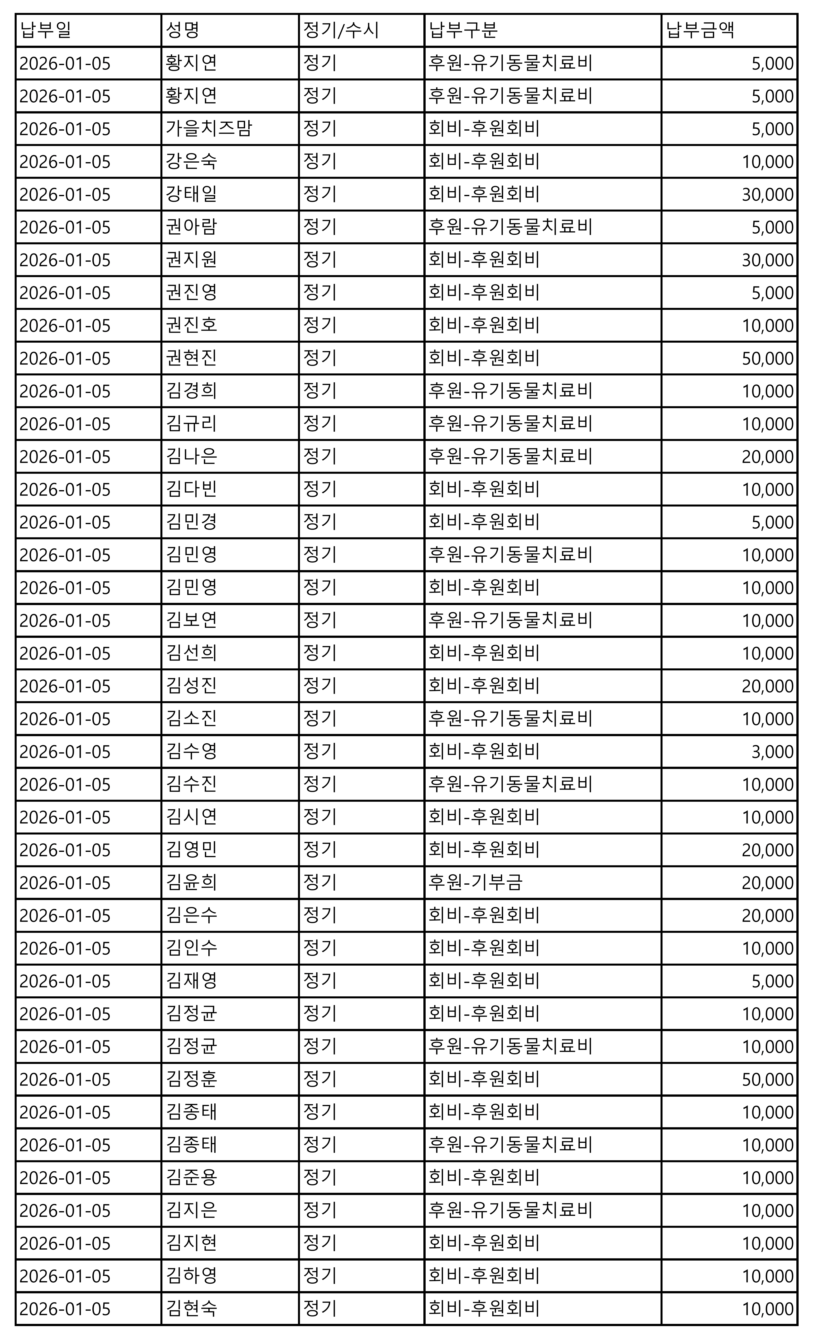 2026년 01월 CMS, 신용카드, 계좌입금을 이용한 정기, 일시후원 리스트
