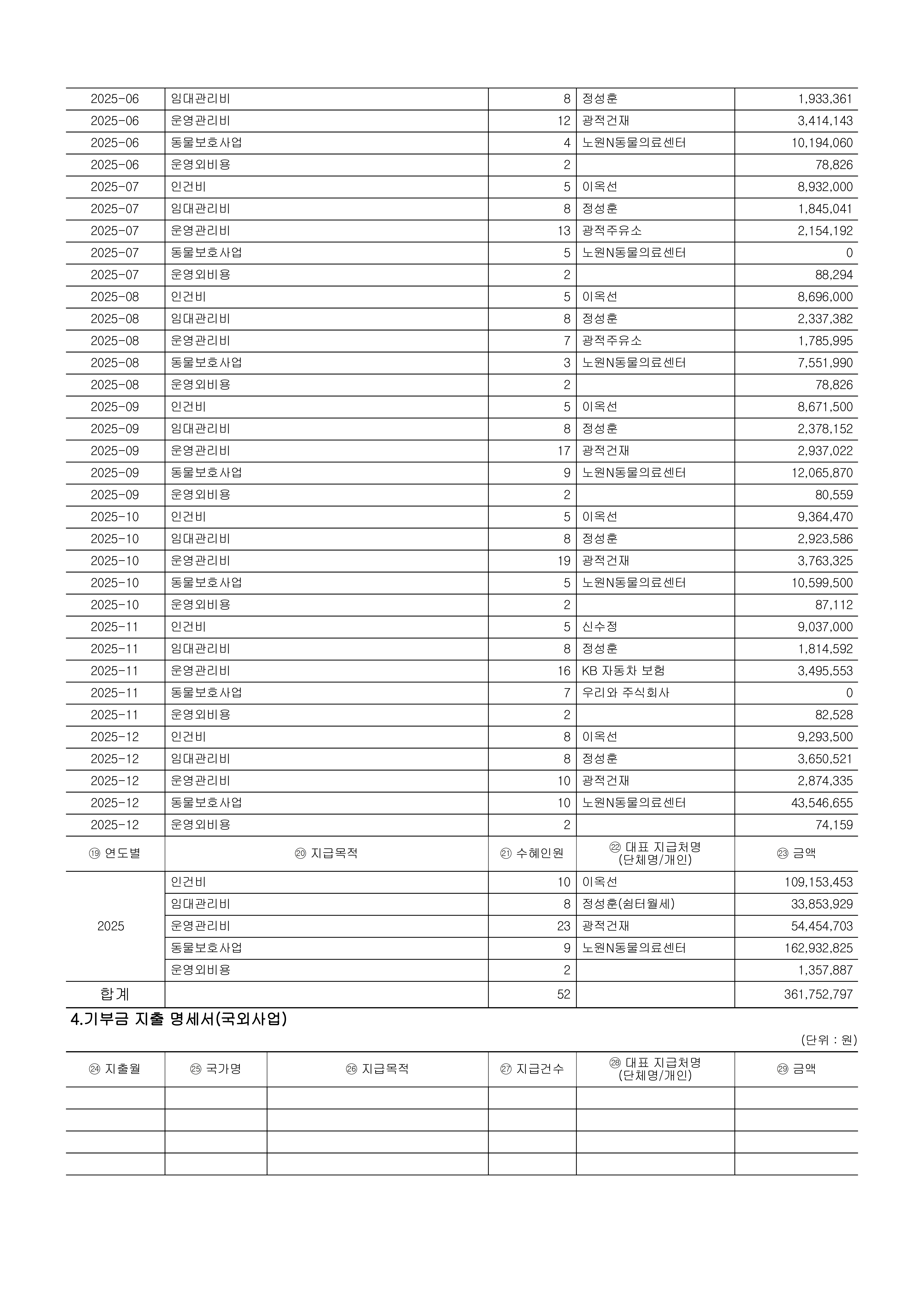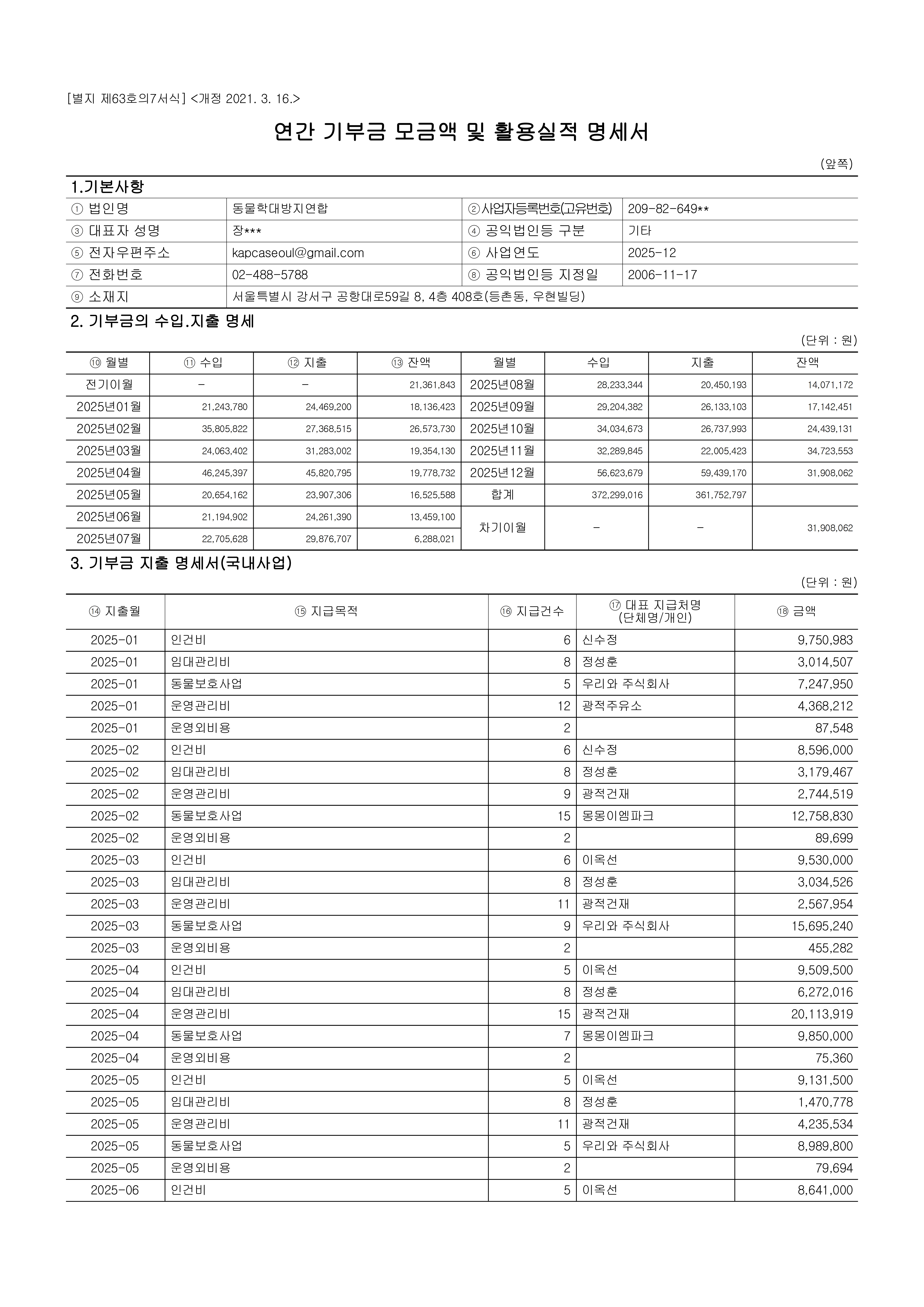 2025년 기부금 모금액 및 활용실적 명세서